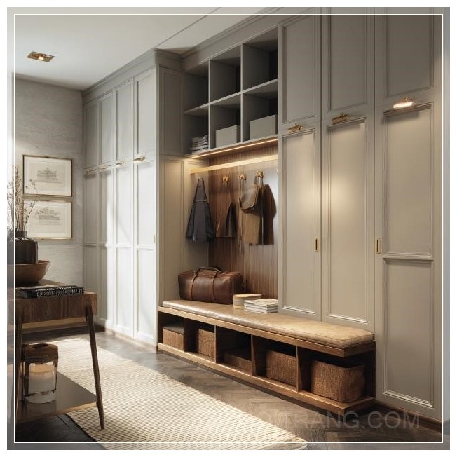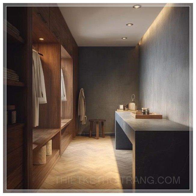 Không gian phòng thay đồ được thiết kế hiện đại và sang trọng, với các kệ treo đồ thông minh và ngăn tủ lưu trữ rộng rãi. Các chi tiết kim loại sáng bóng kết hợp với gương lớn tạo nên cảm giác thoáng đãng và đẳng cấp. Ánh sáng tự nhiên từ cửa sổ lớn chiếu sáng không gian, mang đến sự thoải mái và tiện nghi tối đa cho người sử dụng.