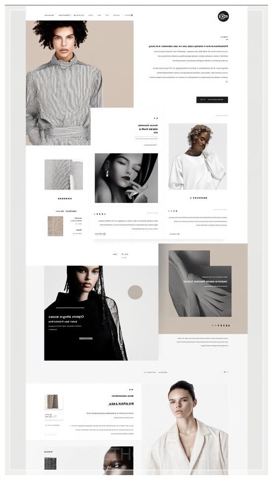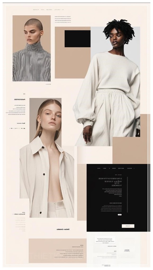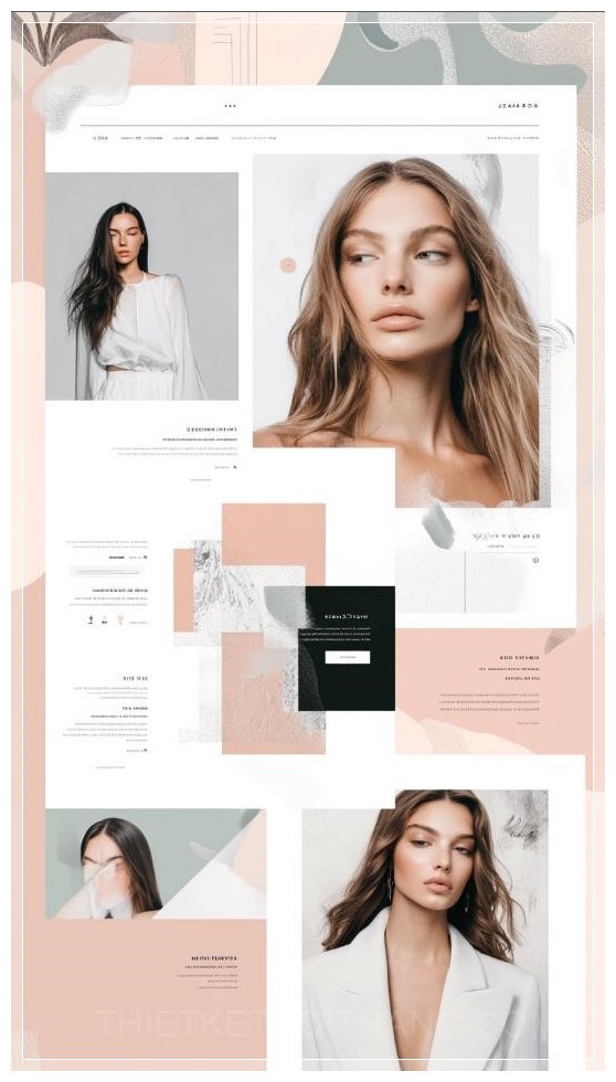 Thiết kế giao diện người dùng tinh tế và hiện đại cho trang chủ của một thương hiệu thời trang. Bố cục nổi bật với bảng màu nhẹ nhàng của các sắc pastel kết hợp với những điểm nhấn đen mạnh mẽ. Các tiêu đề lớn, phong cách thu hút sự chú ý, trong khi hình ảnh sản phẩm sang trọng được khung đẹp mắt. Phông nền có các họa tiết trừu tượng tinh tế, gợi lên cảm giác sang trọng. Không gian trống rộng rãi tạo nên vẻ ngoài gọn gàng, và kiểu chữ tinh tế mang đến một nét hiện đại, lấy cảm hứng từ thẩm mỹ sàn diễn cao cấp.