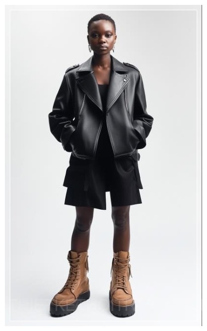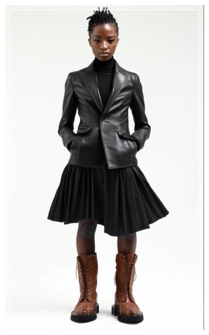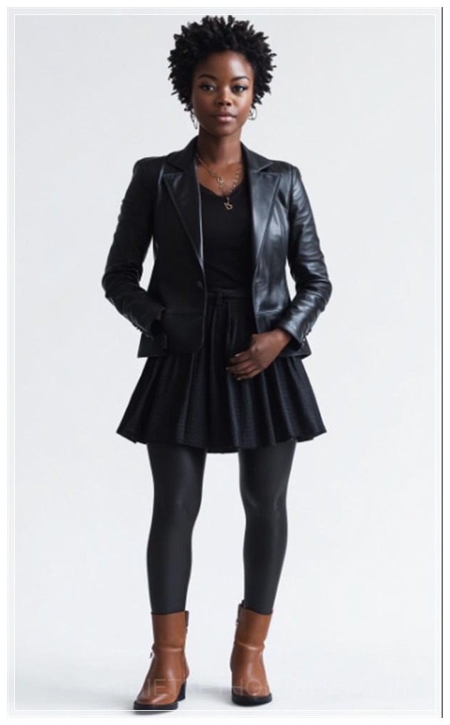 Một bức ảnh của một phụ nữ người Mỹ gốc Phi với mái tóc ngắn, mặc áo khoác da đen và váy theo phong cách Jil Sander, kết hợp với giày Lululemon. Cô đứng đối diện với máy ảnh, nhìn thẳng vào người xem. Đôi giày của cô là đôi boot nâu từ Loewe. Phông nền là màu trắng.
