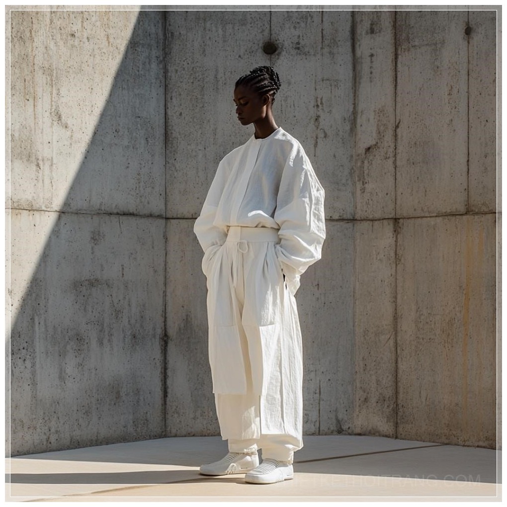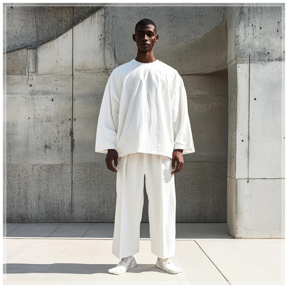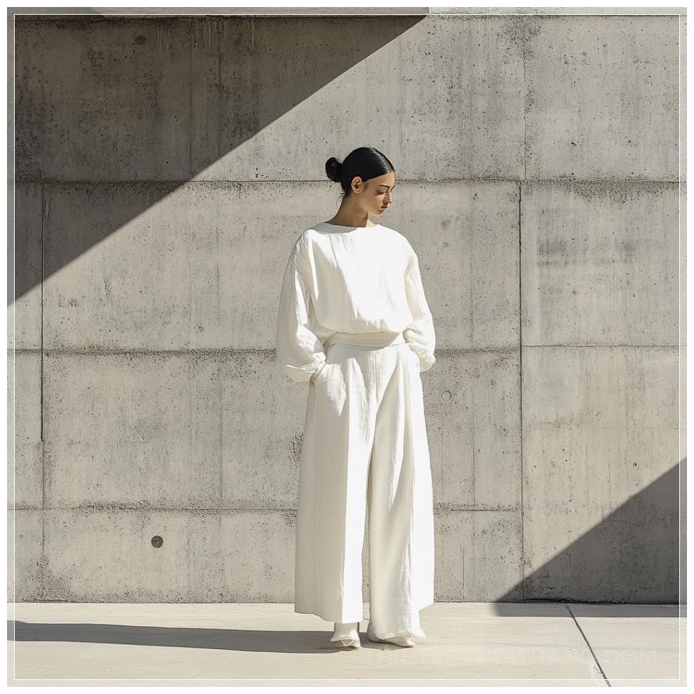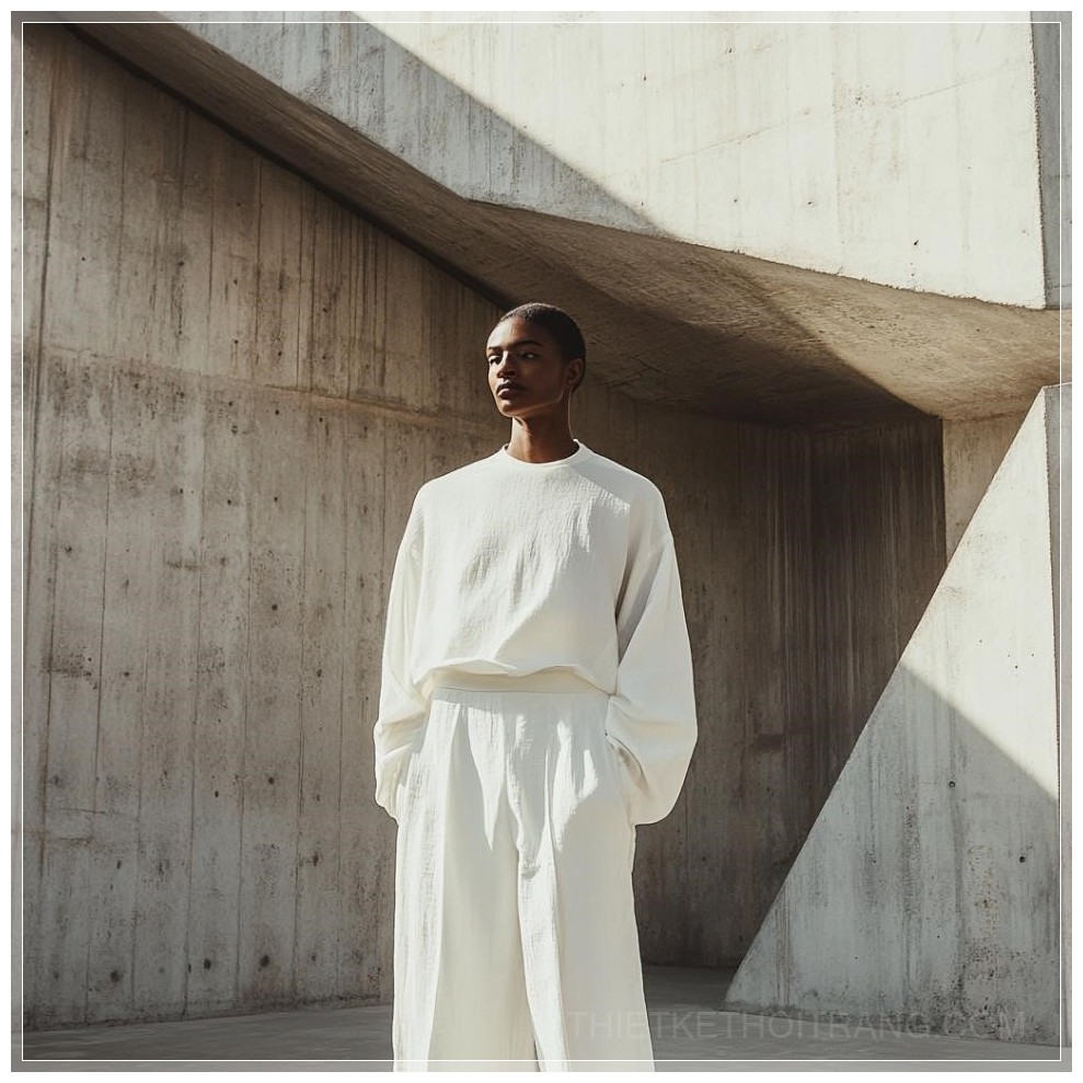 Bức ảnh thể hiện một cá nhân mặc bộ trang phục màu trắng tinh tế, đứng trước nền bê tông công nghiệp. Bộ trang phục, với thiết kế tối giản nhưng sang trọng, bao gồm hai món chính: áo dài tay rộng và quần ống bó cao, cả hai đều được làm từ chất liệu vải mềm mại, có thể là sự kết hợp giữa cotton và linen, mang lại cảm giác thoải mái và thoáng khí.