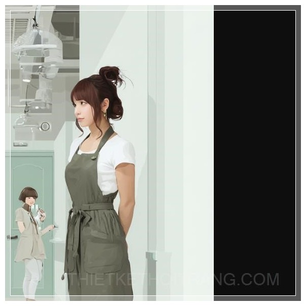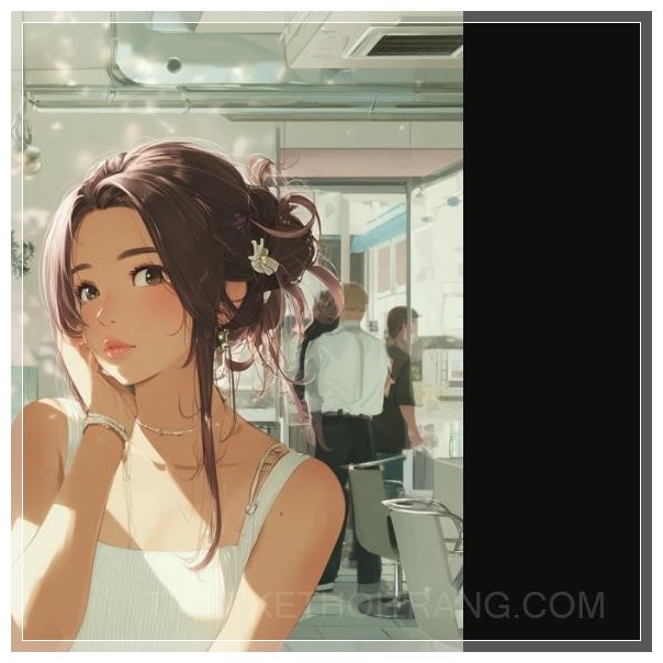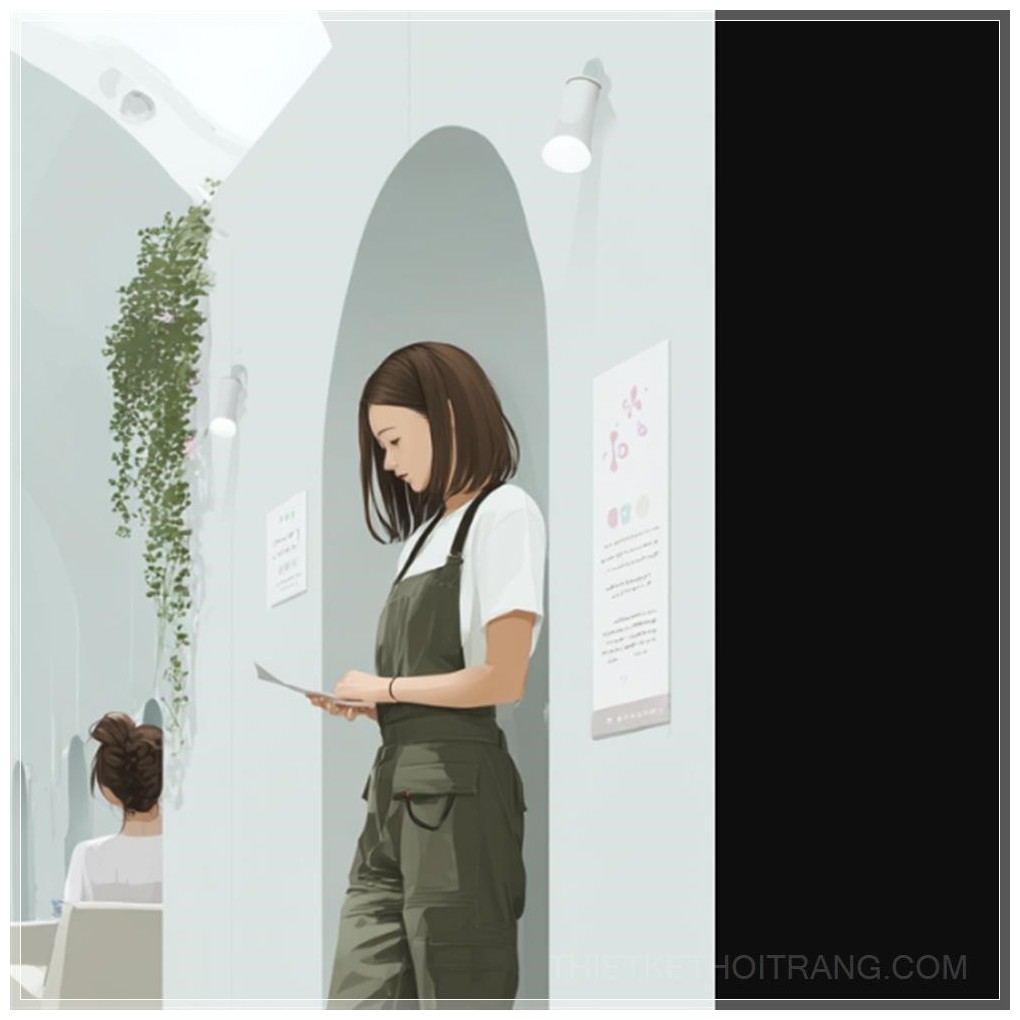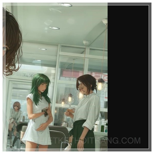 Minh họa phong cách anime của một không gian nội thất tiệm tóc hiện đại, tối giản, một khách hàng đứng với tư thế ngượng ngùng gần cửa ra vào, một thợ cắt tóc điềm tĩnh và chuyên nghiệp trong đồng phục đang trò chuyện lịch sự, ánh sáng nhẹ nhàng, không khí căng thẳng nhẹ, không gian sạch sẽ và hiện đại.
