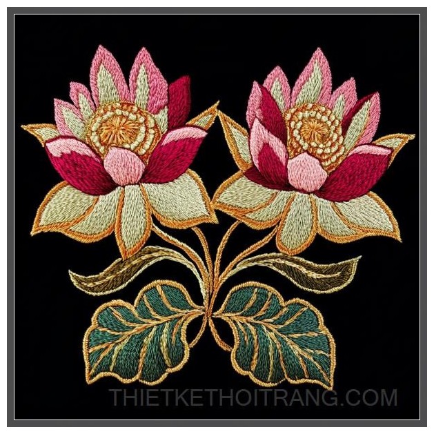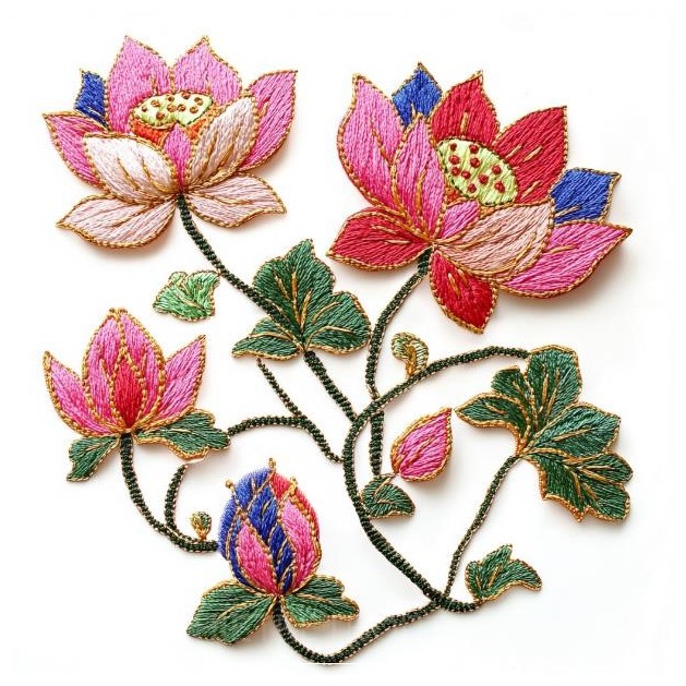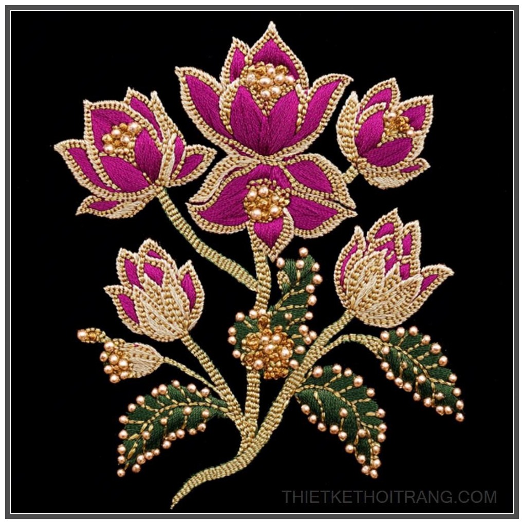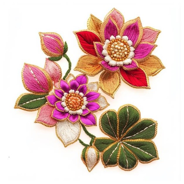 Thiết kế thêu hoa văn sen Jaipuri Gota Patti, bao gồm 2-3 đóa sen.