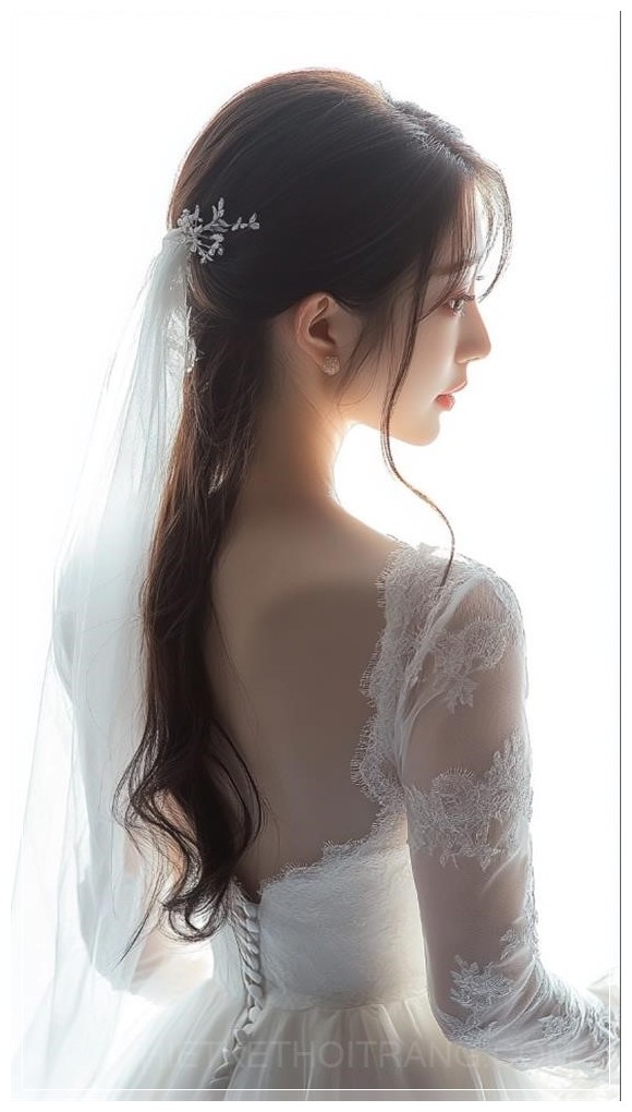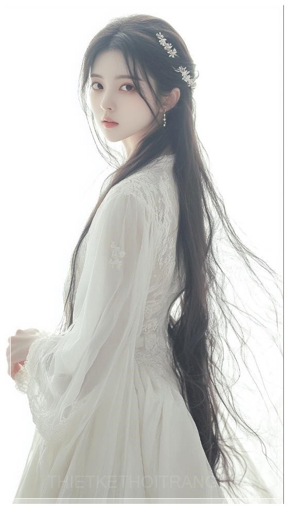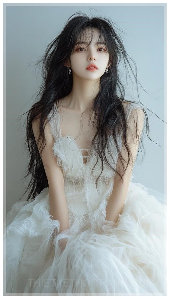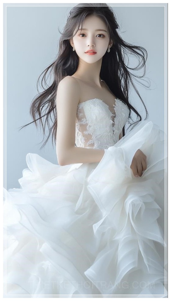 Cô gái Hàn Quốc trong chiếc váy cưới trắng, phong cách những năm 2023, tóc được tạo kiểu với các bước quanh khuôn mặt, kiểu tóc dài, chụp ảnh toàn thân với nền trắng. Sử dụng ống kính 100mm, chất lượng cao, ống kính Sigma 24mm f1.4, ảnh có độ phân giải 16k, chụp ảnh người toàn thân, ánh sáng chính từ phía trước, ảnh cực kỳ sắc nét.