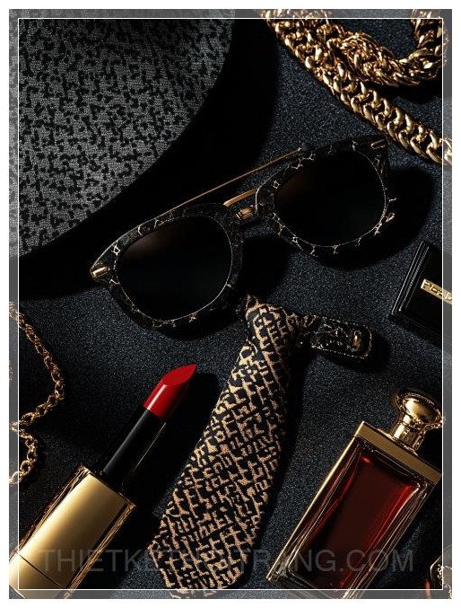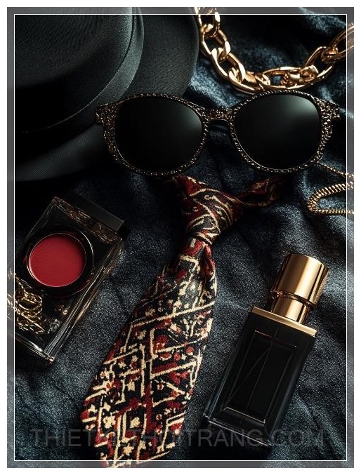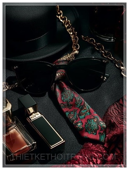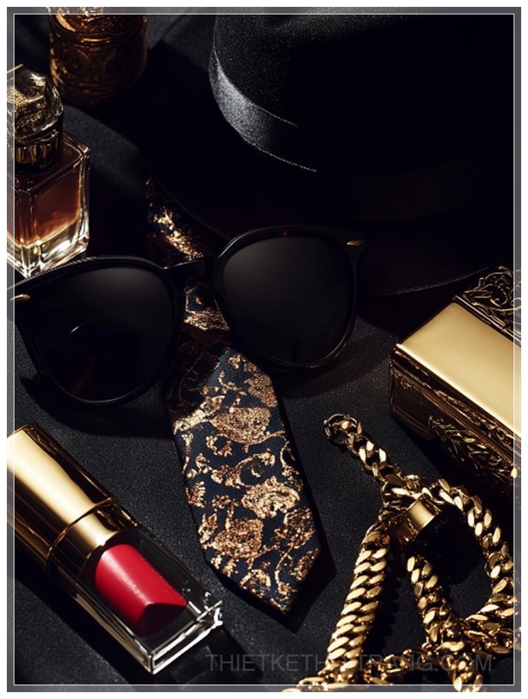 Một bố cục phẳng được cách điệu cao với các vật phẩm lấy cảm hứng từ phong cách gangster Ý cổ điển: kính râm đen tinh tế, một chiếc cà vạt ở giữa với họa tiết nổi bật, một bộ ria mép, mũ gangster đen, son môi đỏ cổ điển trong hộp đựng sang trọng, chai nước hoa có họa tiết cầu kỳ, và một chiếc vòng cổ xích vàng to bản. Ánh sáng điện ảnh, bóng đổ kịch tính, kết cấu phong phú, không khí u ám, độ tương phản cao, phong cách biên tập thời trang.