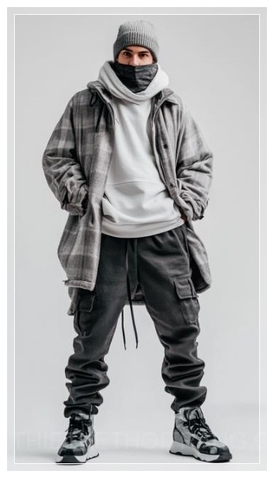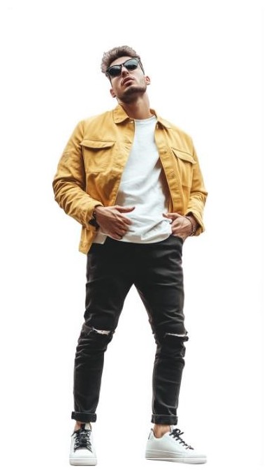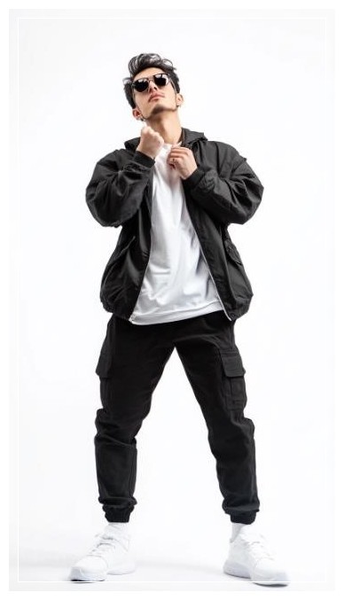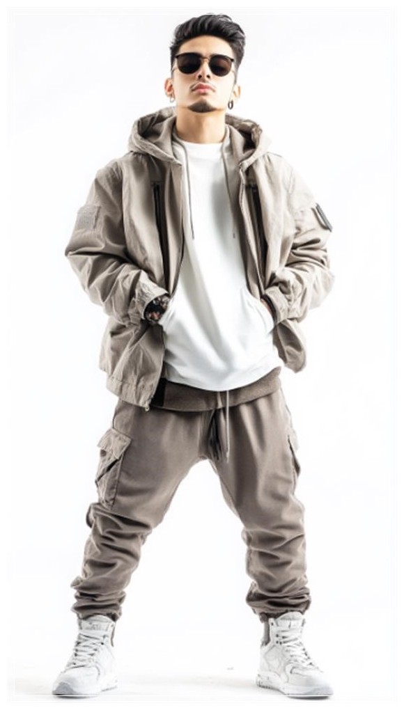 Chàng trai phong cách công viên đường phố thời thượng, mặc bộ trang phục streetwear sành điệu, tạo dáng chụp ảnh, góc chụp từ dưới lên, ảnh toàn thân, nền trắng.