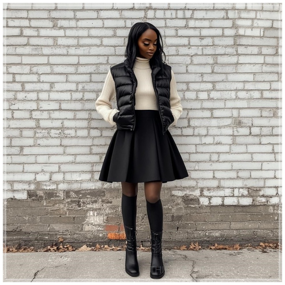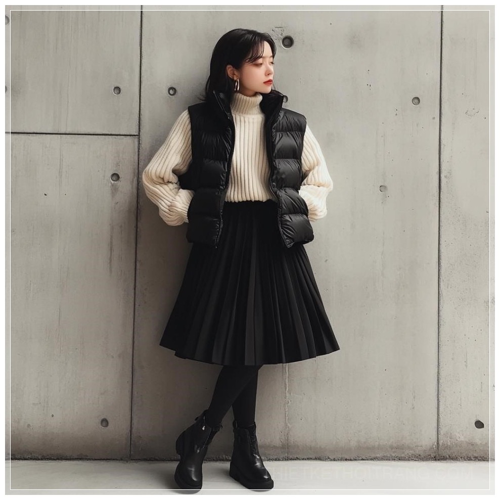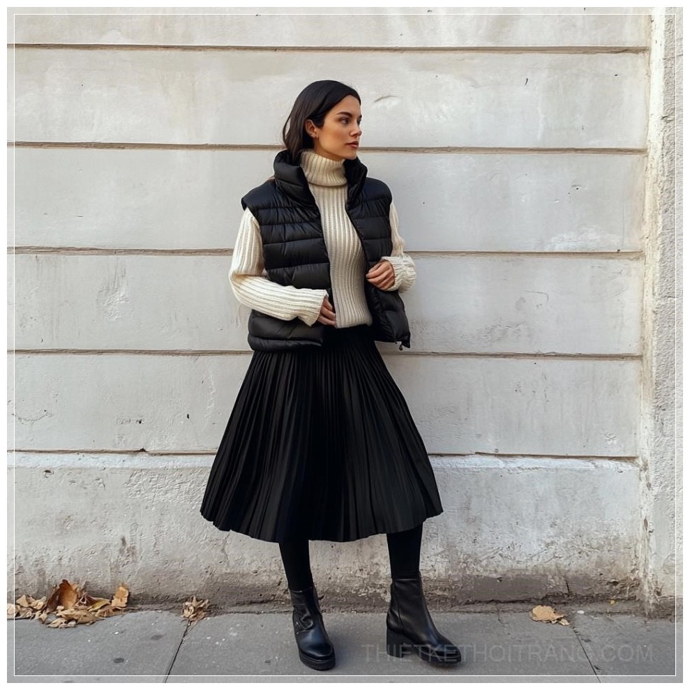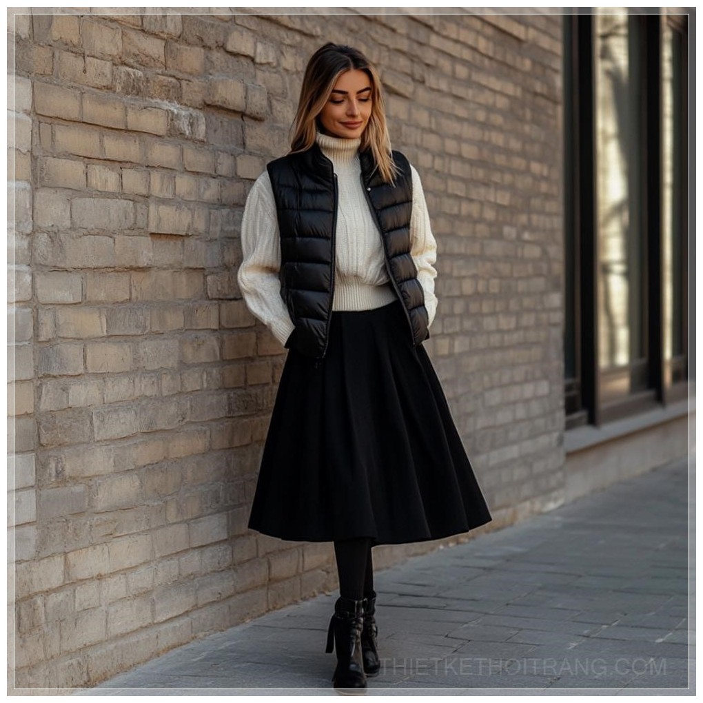 Một bức ảnh thực tế của một cô gái mặc áo vest puffer đen bên ngoài áo cổ lọ màu kem, kết hợp với chân váy midi đen và đôi bốt ankle. Tỷ lệ khung hình 9:6.