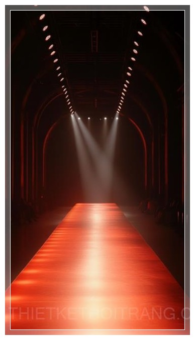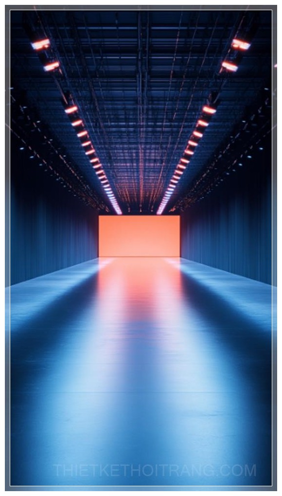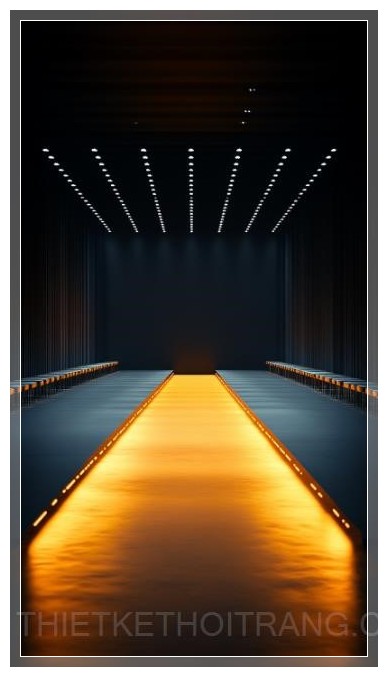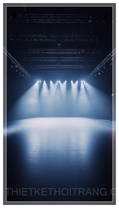 Sân khấu thời trang vắng lặng, không có người mẫu hay người tham gia. Ánh sáng từ các đèn chiếu xuống mặt sàn sáng bóng, tạo ra những phản chiếu mờ ảo. Các hàng ghế xung quanh sân khấu không có người ngồi, chỉ còn lại không gian rộng lớn và trống trải. Bức tường sau sân khấu là một màu trung tính, tạo ra sự tối giản và tĩnh lặng. Cảm giác của không gian là một sự chờ đợi, như thể thời gian đang lắng đọng trong khoảnh khắc yên bình trước khi buổi diễn bắt đầu.