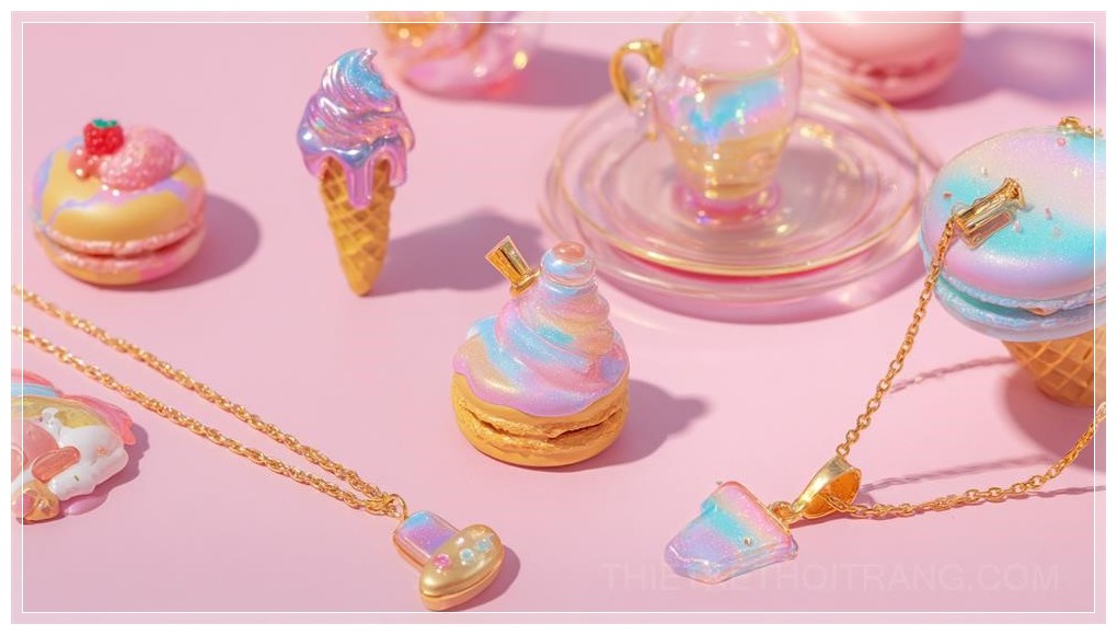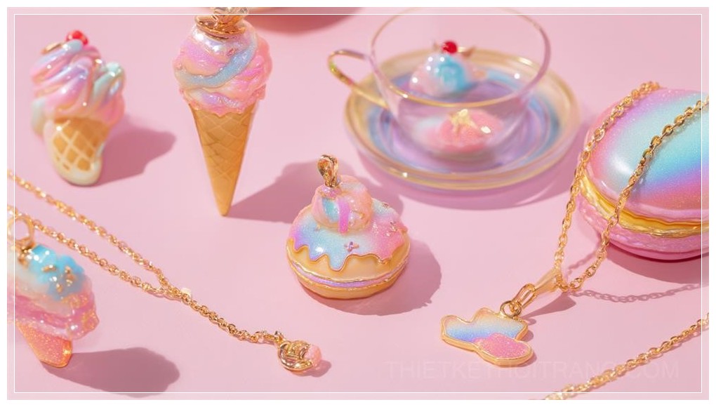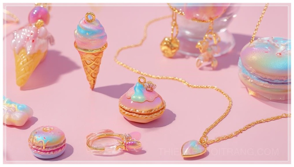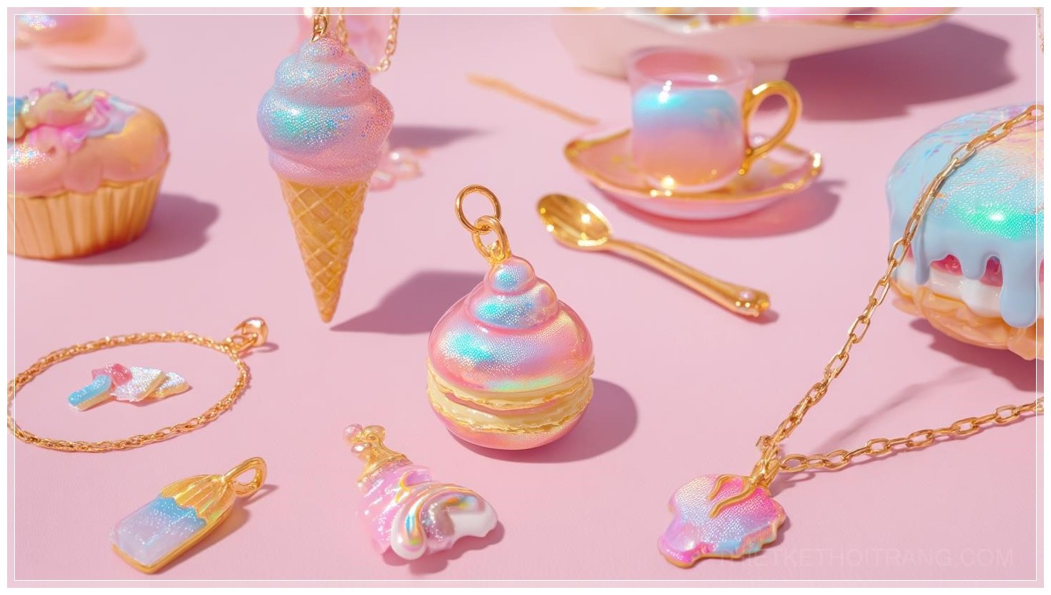 Thiết kế trang sức lấy cảm hứng từ Candyland cho thế hệ Gen Z, với tông màu pastel nhẹ nhàng, vật liệu men bóng và nhựa trong suốt, các kết cấu bánh kẹo tưởng tượng như kem, macarons và kem tươi, mang đến một thẩm mỹ giống như đồ chơi và mơ mộng. Cảnh quay sản phẩm cận cảnh, ánh sáng mềm mại, chi tiết sống động, không có người, độ phân giải cực cao, ảnh chụp siêu thực, nền đơn giản.
