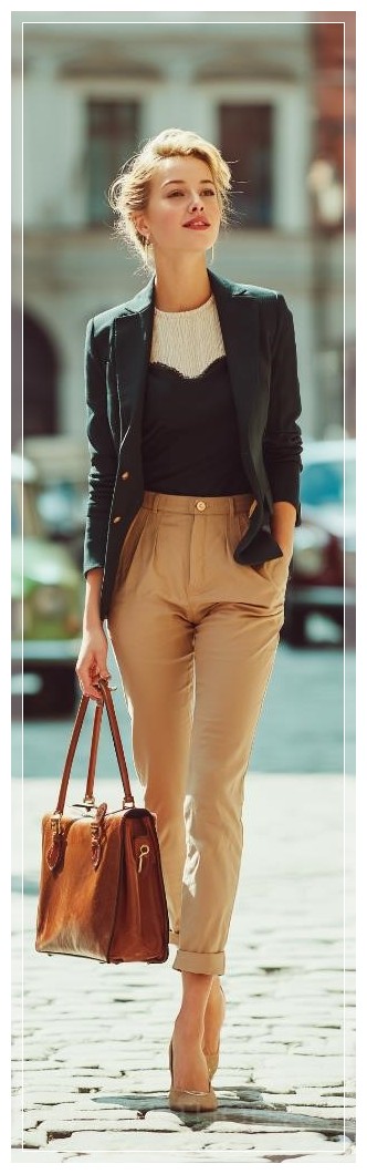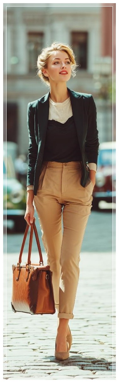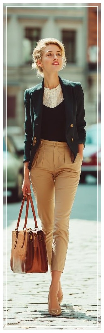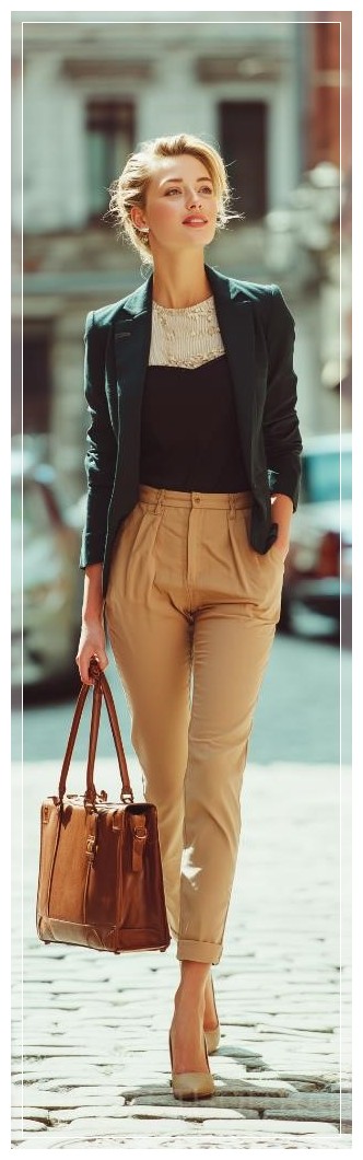 Một cô gái tóc vàng thanh lịch với vóc dáng như người mẫu, mặc bộ trang phục chuyên nghiệp nhưng thời trang, bao gồm một chiếc áo khoác vest vừa vặn, quần tây ôm dáng, và giày cao gót cổ điển. Cô ấy có biểu cảm tự tin và ấm áp, mang theo một chiếc cặp da mỏng, bước đi trong một không gian đô thị hiện đại. Ánh sáng tự nhiên mềm mại, chi tiết thực tế và bầu không khí tinh tế, phong cách retro, thẩm mỹ những năm 1950.