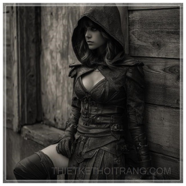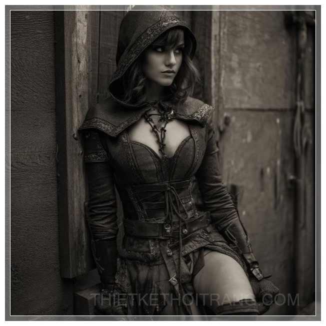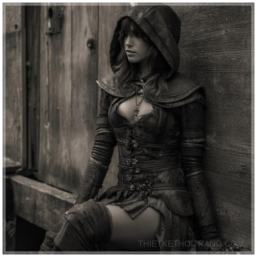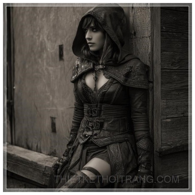 Một bức ảnh toàn thân của Serana từ Skyrim, với cô đứng giữa không gian mờ ảo, ánh sáng nhẹ nhàng chiếu sáng khuôn mặt và cơ thể của cô. Serana mặc trang phục truyền thống của một thợ săn ma, với bộ đồ đen tối giản, giày ủng cao cổ, và chiếc áo choàng rộng phấp phới. Tóc dài, đen nhánh của cô được xếp gọn gàng sau lưng, cùng với đôi mắt đỏ rực lấp lánh như ánh sao trong đêm tối. Mái tóc và bộ trang phục tạo nên một sự tương phản mạnh mẽ với bối cảnh xung quanh. Cô đứng với một vẻ mặt tự tin, một tay cầm cây gậy phép, tay kia dứt khoát đặt xuống hông, sẵn sàng chiến đấu trong thế giới đầy nguy hiểm của Skyrim.