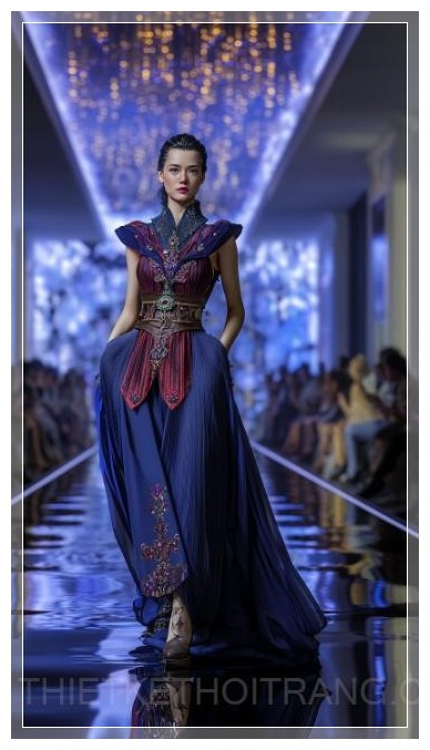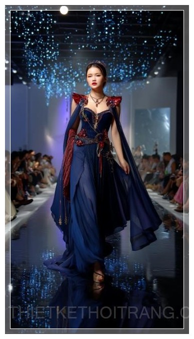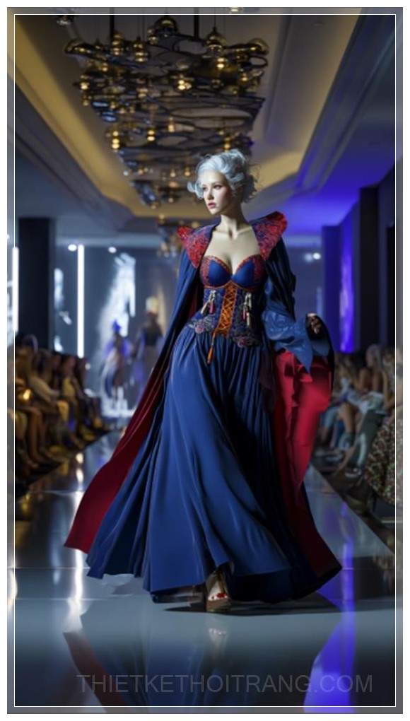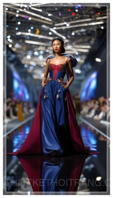 Mô hình thời trang cao 180cm với những đặc điểm mềm mại, lấy cảm hứng từ nàng Bạch Tuyết, tự tin sải bước trên sàn runway dài và thanh lịch, mặc bộ váy haute couture tái hiện hiện đại chiếc váy đặc trưng của Bạch Tuyết. Bộ váy có màu xanh hoàng gia sâu thẳm, điểm nhấn đỏ đậm, phần thân áo được cấu trúc chặt chẽ, vải cao cấp bay bổng, những chi tiết giống như đá quý. Ánh sáng mạnh mẽ từ trần nhà sàn diễn thời trang chiếu xuống, khán giả mờ nhạt ở phía sau, phản chiếu trên sàn runway bóng loáng, không gian hiện đại, ánh sáng điện ảnh, độ phân giải cực cao, phong cách nhiếp ảnh thực tế, giống như một bộ ảnh tạp chí Vogue.