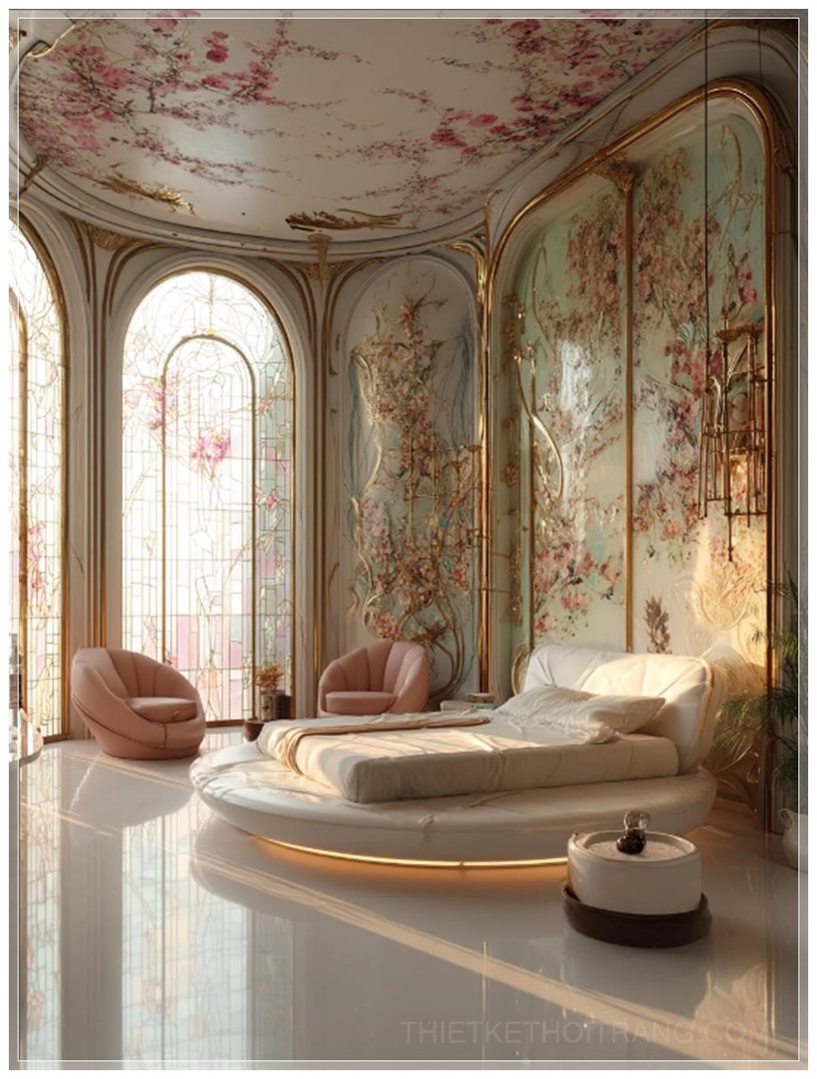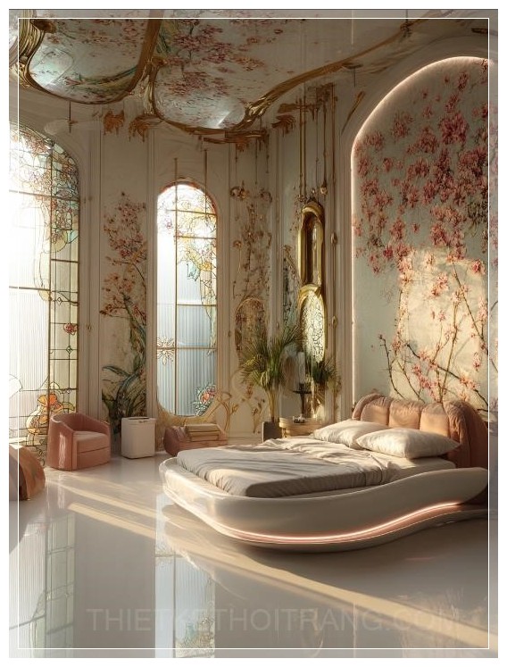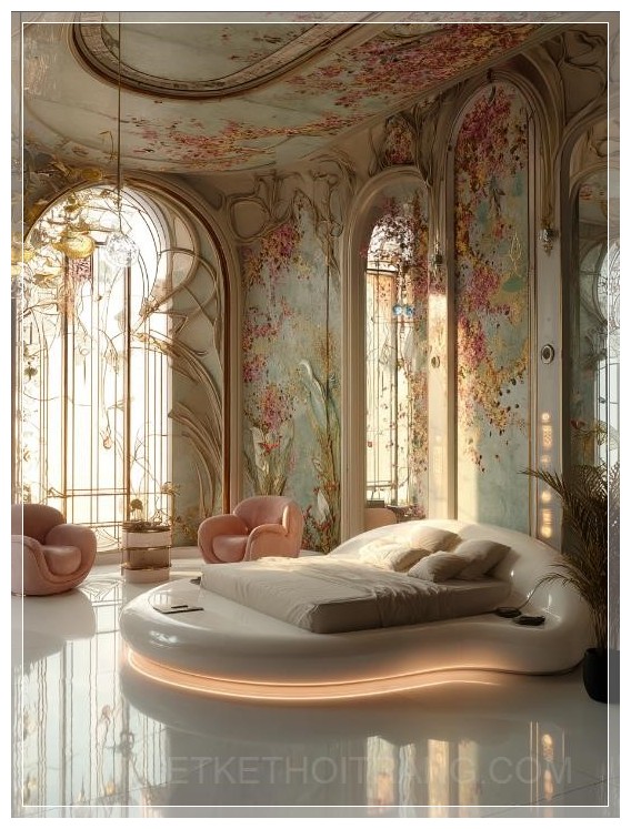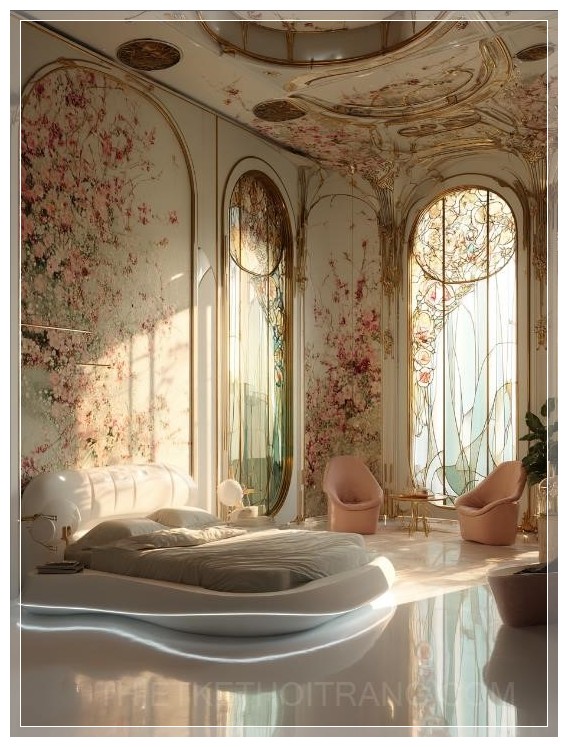 Khám phá một không gian phòng ngủ kỳ diệu, nơi phong cách Art Nouveau cổ điển giao thoa với những yếu tố tương lai đột phá. Từng chi tiết đều mang đến một sự hài hòa độc đáo, từ những bức tường hoa văn tinh tế cho đến những món đồ nội thất công nghệ cao, tạo nên một không gian vừa sang trọng vừa tiên tiến.