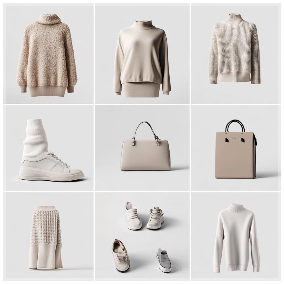 Create a minimalist grid featuring a variety of fashion products. Each item should be sleek and modern, with clean lines and a focus on neutral or muted colors like beige, black, white, gray, and soft pastels. Include the following items in the grid: skirts, structured shoulder bags, plain t-shirts, tailored jackets, stylish hats, and trendy oversized sweaters. Use a soft, even lighting setup against a plain white or light gray background to emphasize the simplicity and elegance of each product. The grid should be evenly spaced, with all items presented in a balanced and aesthetically pleasing arrangement, showcasing their individual design while maintaining a cohesive visual theme. --profile ojoqpua --v 6.1