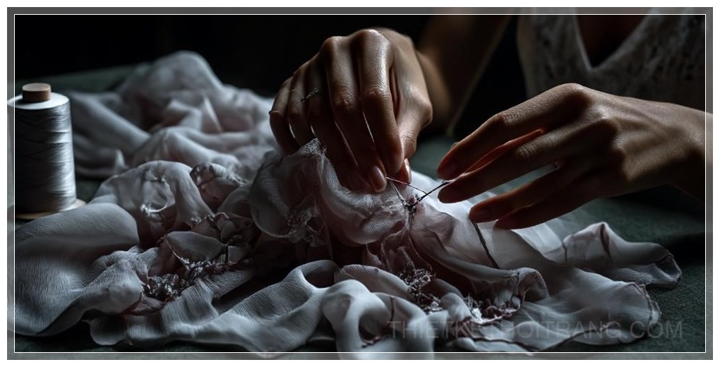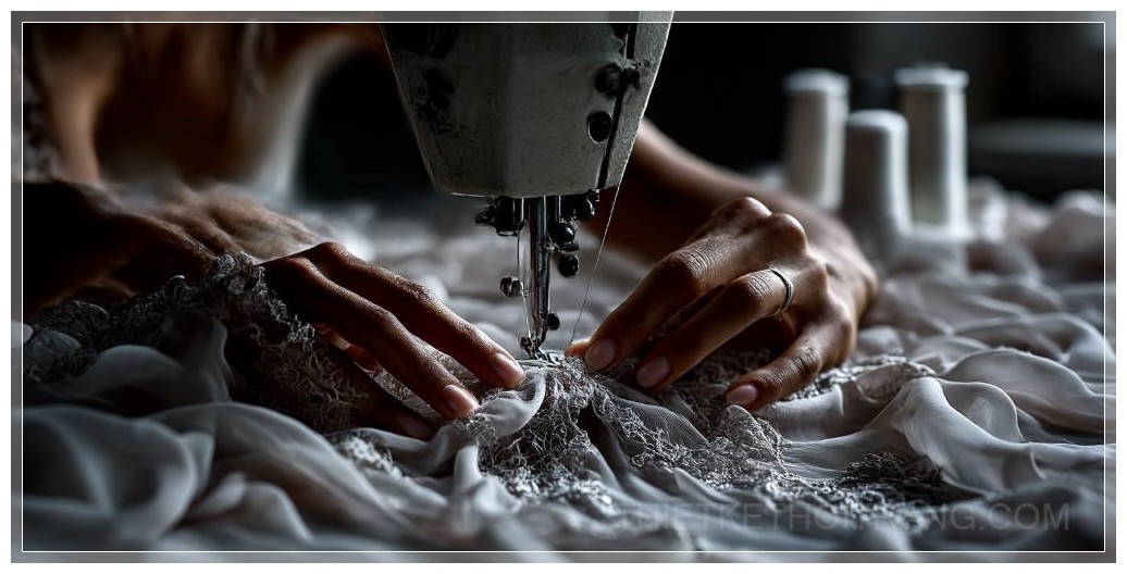 hands of a dressmaker sewing delicate chiffon fabric, romantic atmosphere, soft lighting, close-up, emotional focus, handmade fashion mood --ar 2:1 --profile 3nm5hle --stylize 350 --v 7.0