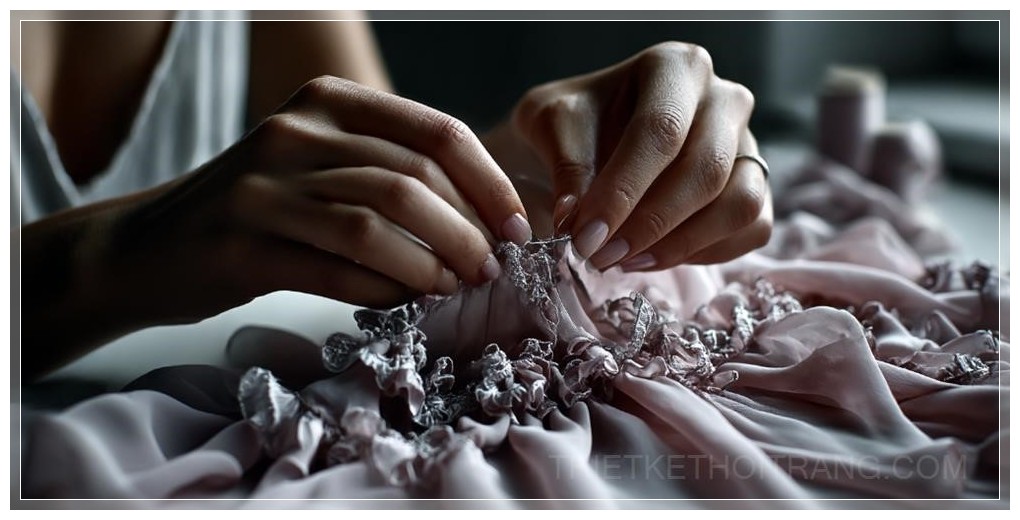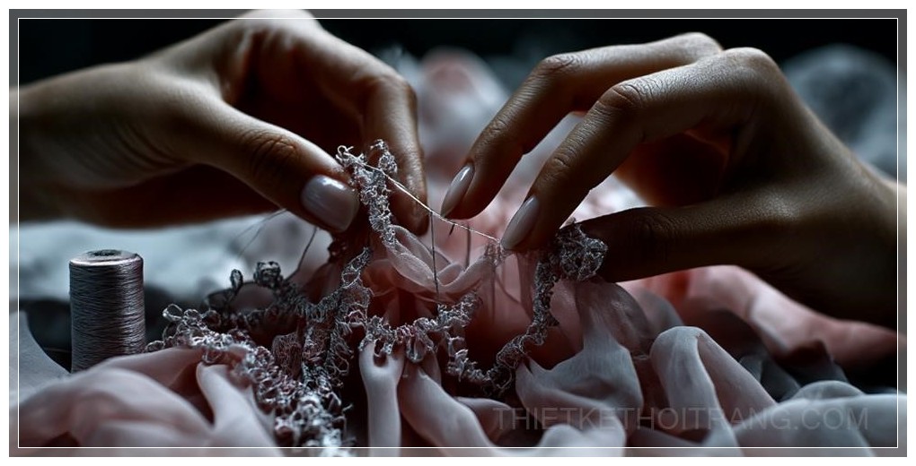 Trong một không gian nhẹ nhàng, ánh sáng mềm mại chiếu vào từng sợi vải chiffon mỏng manh, những đôi tay của người thợ may lướt qua các đường kim mảnh mai, tạo nên sự kết hợp hoàn hảo giữa kỹ thuật và cảm xúc. Mỗi mũi chỉ, từng nếp vải uốn lượn, như thể những cảm hứng lãng mạn đang dần hình thành dưới bàn tay tài hoa của người nghệ nhân. Chiffon, với sự mềm mại và bay bổng của nó, không chỉ là chất liệu, mà là cảm giác được thêu dệt lên từng đường kim, từng sợi chỉ, mang lại một vẻ đẹp vừa nhẹ nhàng, vừa đầy sức sống.