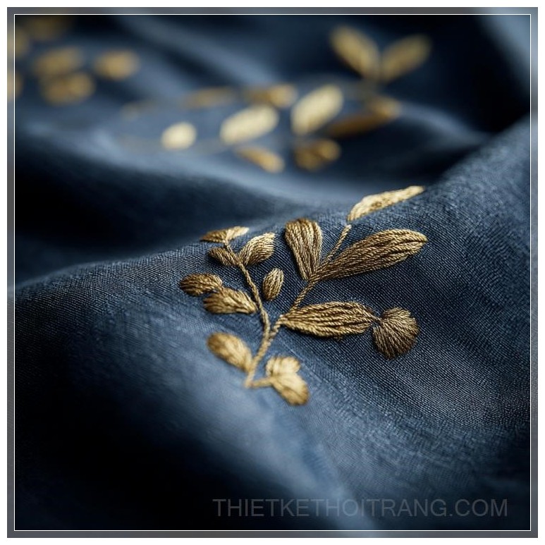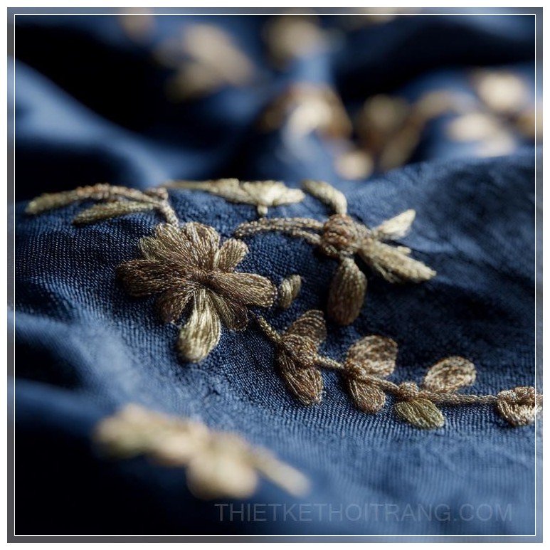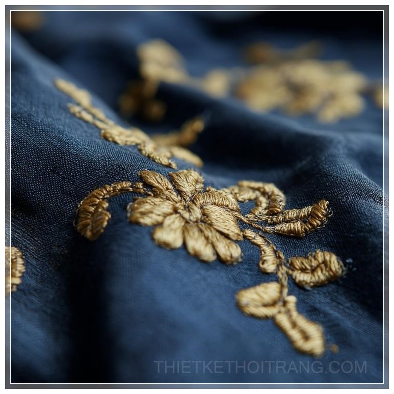 Vải satin xanh dương đậm mang lại cảm giác huyền bí và sâu lắng, làm nổi bật sự tinh tế của các chi tiết thêu. Những hoa văn thêu bằng chỉ vàng không chỉ đơn giản là một họa tiết mà là một sự kết hợp hoàn hảo giữa truyền thống và sự đổi mới, giữa sự mềm mại của satin và vẻ đẹp kiêu kỳ của kim tuyến vàng.