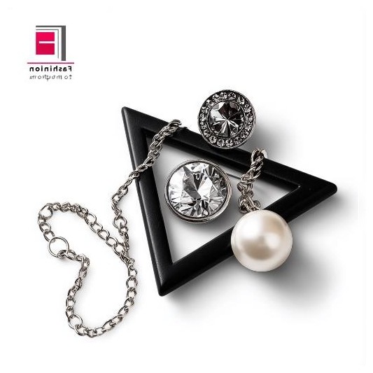 An image of the fashion pin set consisting of three different jewel buttons, one diamond button, and two pearls with a silver chain in a black triangle shape on a white background. The diamond is large and has no lettering on it. There should be another small, bear-shaped pearl button next to them. A logo F emphasizes fashion must appear in the top right corner of the photo. In general, ensure that only these elements are visible. Use professional photography techniques for product shooting. --v 7.0 --p wh5bvp7