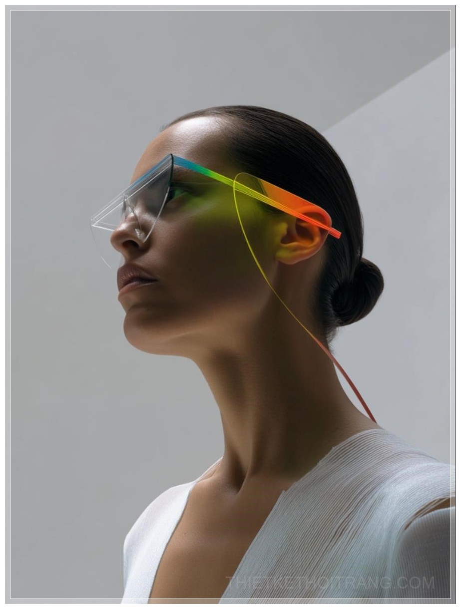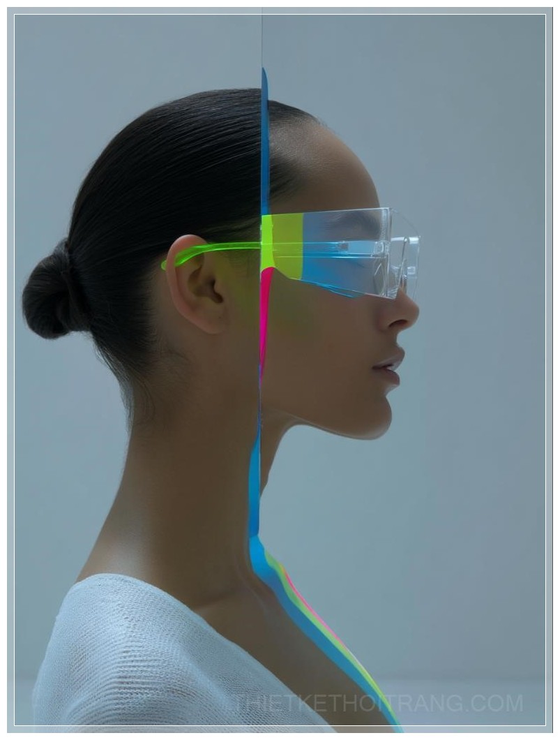 Trong không gian trắng toát, nơi mà công nghệ và thời trang giao thoa, một mẫu thiết kế thời trang cao cấp hiện ra như một tác phẩm nghệ thuật đương đại. Mẫu người mẫu xuất hiện với đôi kính pha lê độc đáo, kết hợp giữa kính trong suốt và kính mờ, phản chiếu những tia sáng neon lấp lánh. Các chi tiết giao thoa giữa kính và trang phục tạo nên một hiệu ứng thị giác đầy mê hoặc, như thể một phần của thế giới ảo đang hòa nhập vào thực tại.