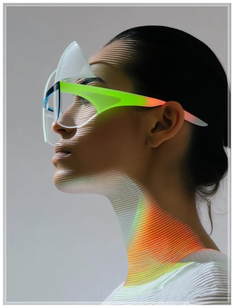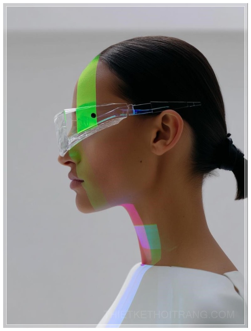 Không gian xung quanh được bao phủ bởi một màu trắng tinh khiết, làm nổi bật những đường nét sắc sảo trên bộ trang phục của người mẫu. Những dải sọc neon uốn lượn, tích hợp trong từng chi tiết của kính và trang phục, làm bật lên một cảm giác về công nghệ tiên tiến, khẳng định sự liên kết giữa thời trang và tương lai.