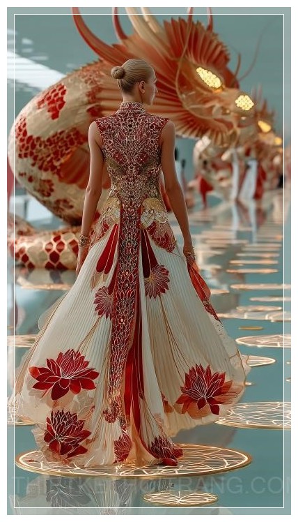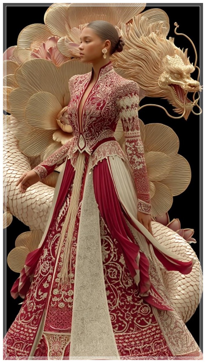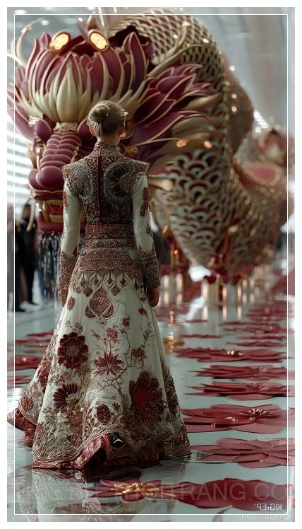 Trên sàn diễn thời trang đương đại, một nữ hoàng Ấn Độ toát lên vẻ đẹp huyền bí và thanh thoát khi bước đi tự tin, khuôn mặt nàng nhẹ nhàng nhưng đầy quyền lực. Cô diện một chiếc váy lehenga cao cấp, với những gam màu đỏ ruby đậm và ivory tinh tế, tạo nên sự kết hợp hoàn hảo giữa sự cổ điển và hiện đại. Từng bước đi của nàng dường như làm bừng sáng cả không gian, như thể cô đang bước đi trên một con đường lót hoa sen đang nở rực rỡ dưới ánh sáng huyền bí.