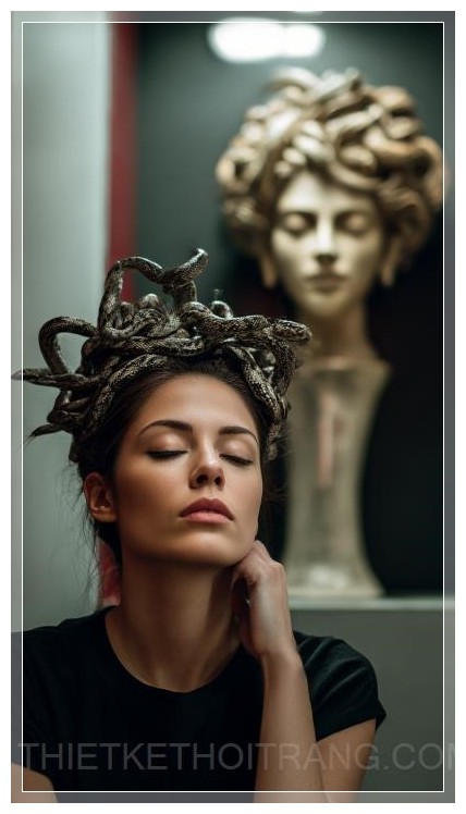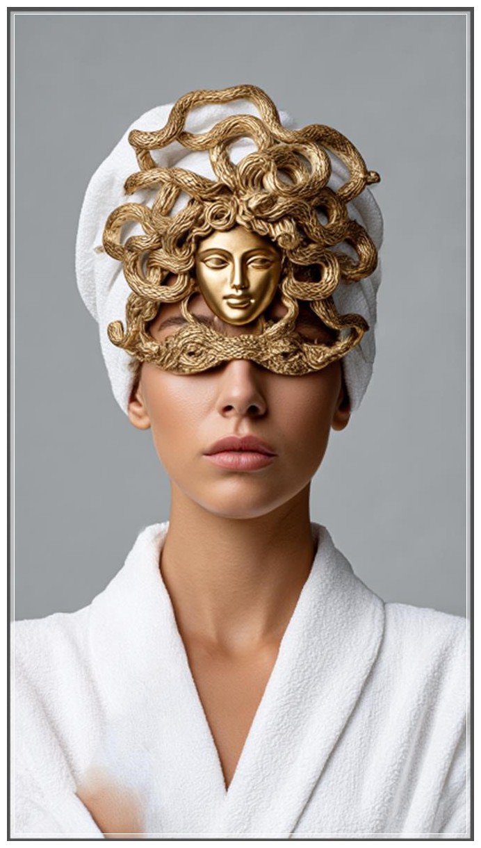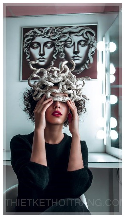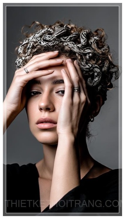 Trong không gian tĩnh lặng của một studio sắc đẹp hiện đại, một người phụ nữ của thế hệ mới đứng lặng lẽ, thể hiện hình ảnh huyền bí của Gorgon Medusa. Mái tóc cô bùng nổ trong những hình dạng uốn lượn, phản chiếu những con rắn ngoằn ngoèo, như thể chính những con quái vật ấy sống động trên làn tóc dài mượt mà. Cô tựa mình vào chiếc gương lớn, nhưng ánh mắt không thể nhìn thấy, hoàn toàn ẩn sau một lớp bóng tối mờ ảo.