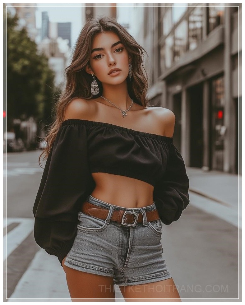 Trên một góc phố đông đúc, ánh nắng nhẹ nhàng phản chiếu trên bộ trang phục giản dị nhưng đầy cuốn hút. Một cô gái với mái tóc nâu dài mượt mà, tựa như một bức tranh sống động giữa lòng thành phố. Cô khoác trên mình chiếc áo dài tay đen, thiết kế trễ vai quyến rũ, kết hợp cùng chiếc quần short trẻ trung, toát lên vẻ năng động nhưng không kém phần nữ tính.