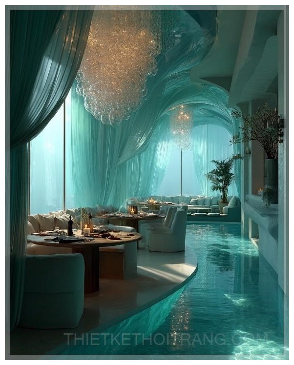 Giữa không gian huyền bí của đại dương, nhà hàng này khơi gợi lên một cảm giác thư giãn tuyệt vời như bước vào một cung điện của những nàng tiên cá. Những gam màu turquoise mơ màng kết hợp với ánh sáng dịu nhẹ tạo nên một không gian như được bao phủ bởi làn nước trong suốt. Được thiết kế để tái hiện vẻ đẹp kỳ diệu của thế giới dưới đáy biển, từng chi tiết trong không gian đều toát lên sự thanh thoát và đầy lôi cuốn.