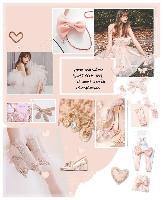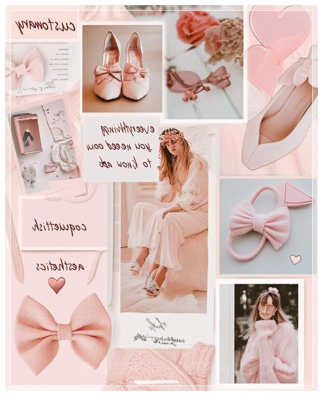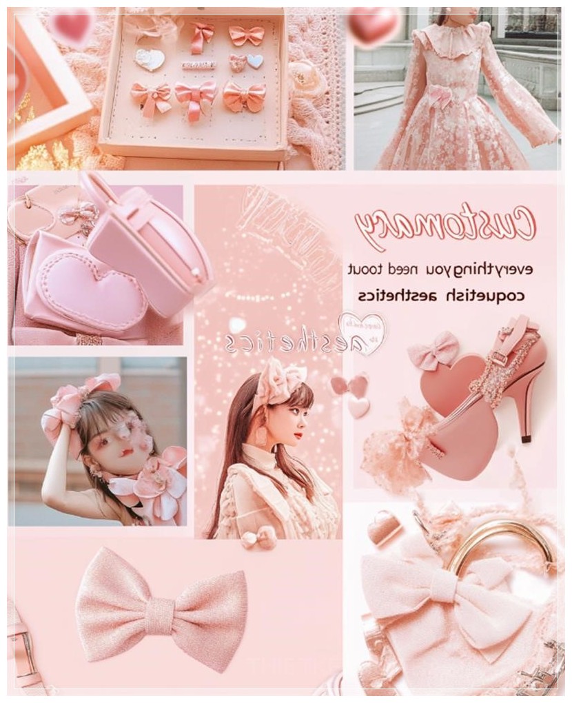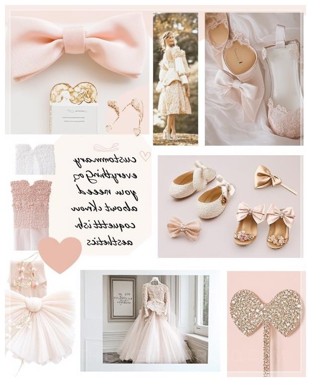A moodboard for an Instagram post, featuring photos of coquette aesthetic outfits and accessories like bows, bow shoes, pastel pink tones, and the text customary everything you need to know about coquettish aesthetics in cursive font. The background is a soft blush with heart-shaped accents, and each photo has its own frame, creating a collage effect. --ar 13:16 --s 50