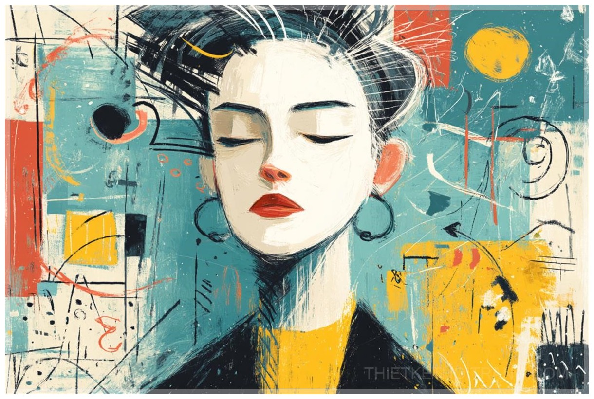 Trong không gian sáng tạo đậm chất siêu thực, chúng ta bắt gặp hình ảnh một người phụ nữ đầy mê hoặc, lạc lõng trong một thế giới vừa mộng mơ, vừa hỗn loạn. Chắc chắn, những nét vẽ mạnh mẽ và những gam màu sống động từ phong cách của Stuart Davis kết hợp cùng những nét vẽ ngẫu hứng và chất liệu đầy cảm xúc của CyTwombly đã tạo nên một bức tranh nghệ thuật đầy lôi cuốn.