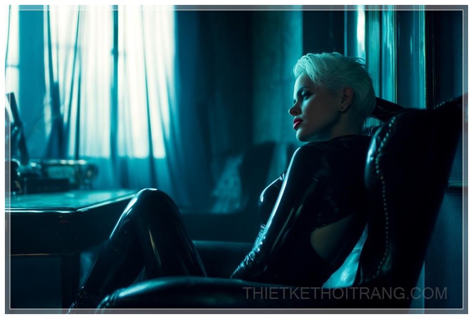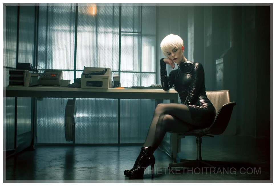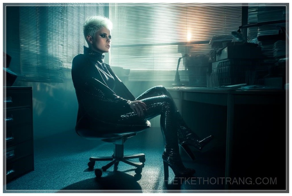 Giữa không gian tối tăm của một văn phòng mang đậm chất retro sci-fi, cô nàng femme fatale mang vẻ đẹp quyền lực, quyến rũ và đầy bí ẩn, giống như một sinh vật không thuộc về thế giới này. Với mái tóc ngắn màu trắng lạnh lùng, gương mặt sắc nét và ánh mắt thẳm sâu đầy huyền bí, cô ngồi trên chiếc ghế trong tư thế đầy tự tin, như một nữ hoàng trong vũ trụ của Blade Runner.