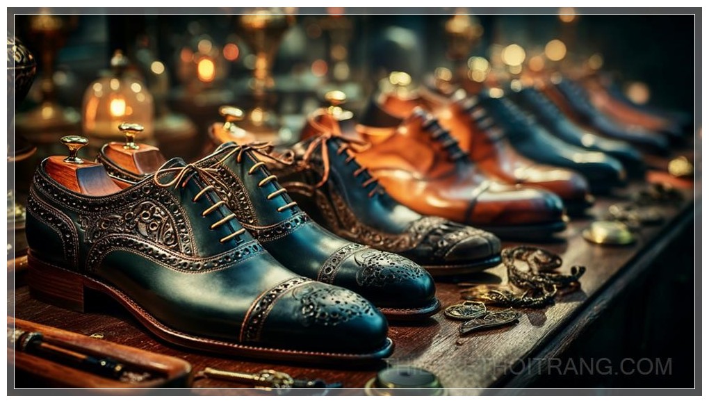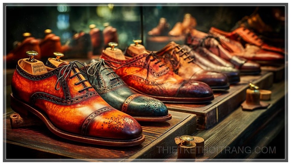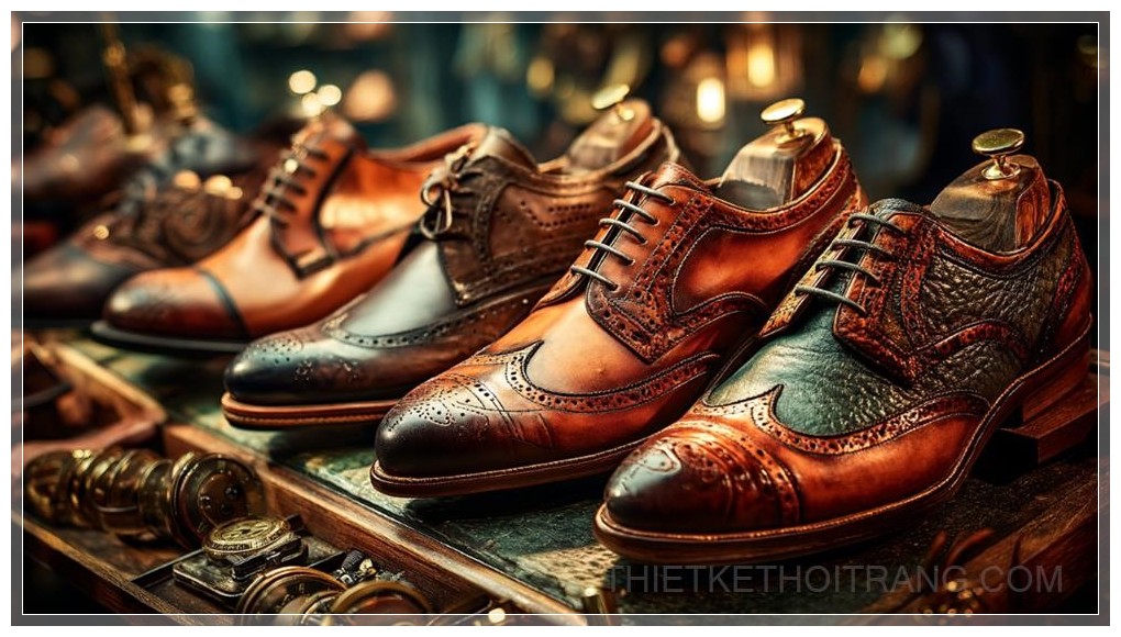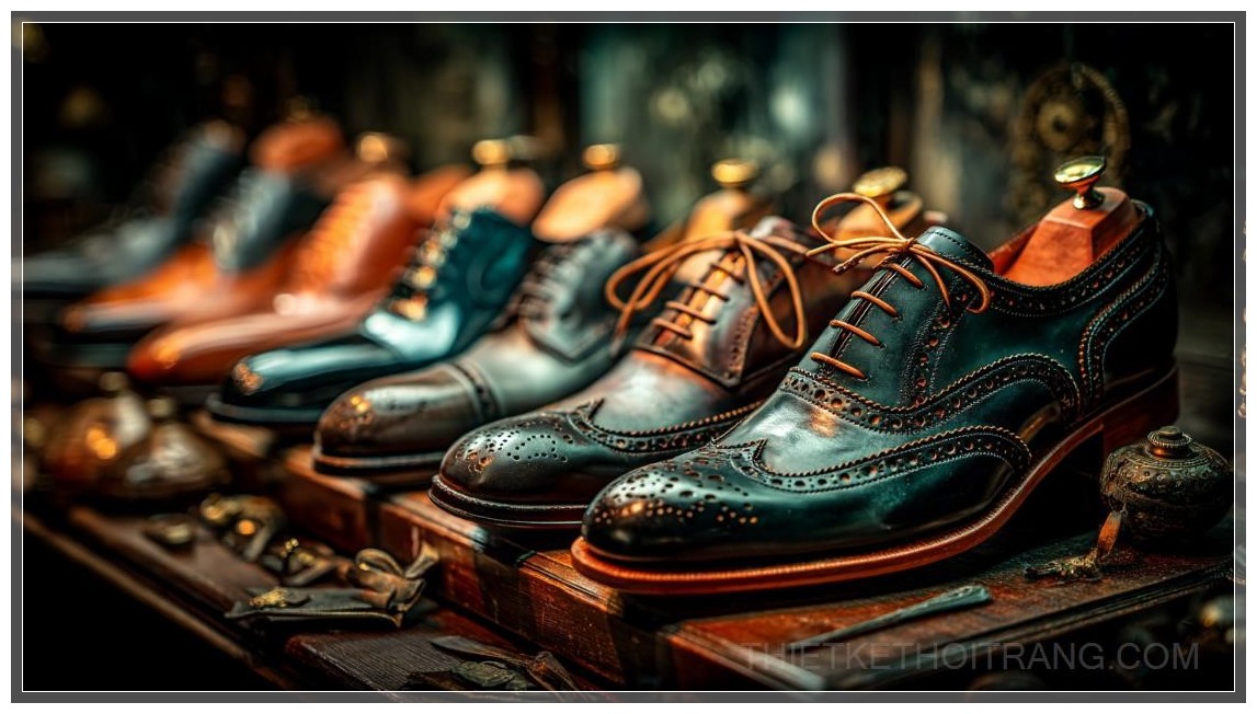 Trong không gian sang trọng của một cửa hàng thời trang cao cấp, đôi giày dress nam bóng loáng tỏa sáng dưới ánh sáng ấm áp, thu hút mọi ánh nhìn. Mỗi chi tiết của đôi giày đều thể hiện sự tinh xảo, từ lớp da bóng mượt đến đường may chắc chắn, phản ánh sự tỉ mỉ trong quá trình chế tác. Được trưng bày trên một mặt bàn gỗ mịn màng, đôi giày như một tác phẩm nghệ thuật, nơi mỗi đường cong của đế giày được chạm khắc một cách hoàn hảo để tôn vinh đôi chân mạnh mẽ và lịch lãm.