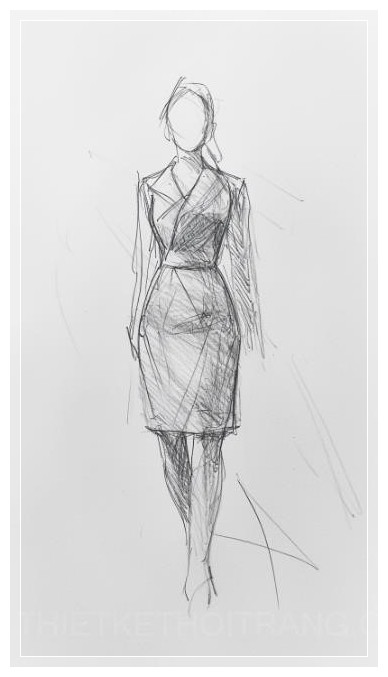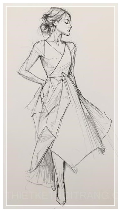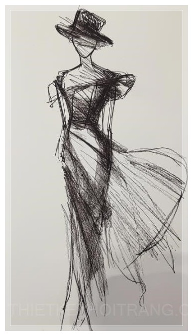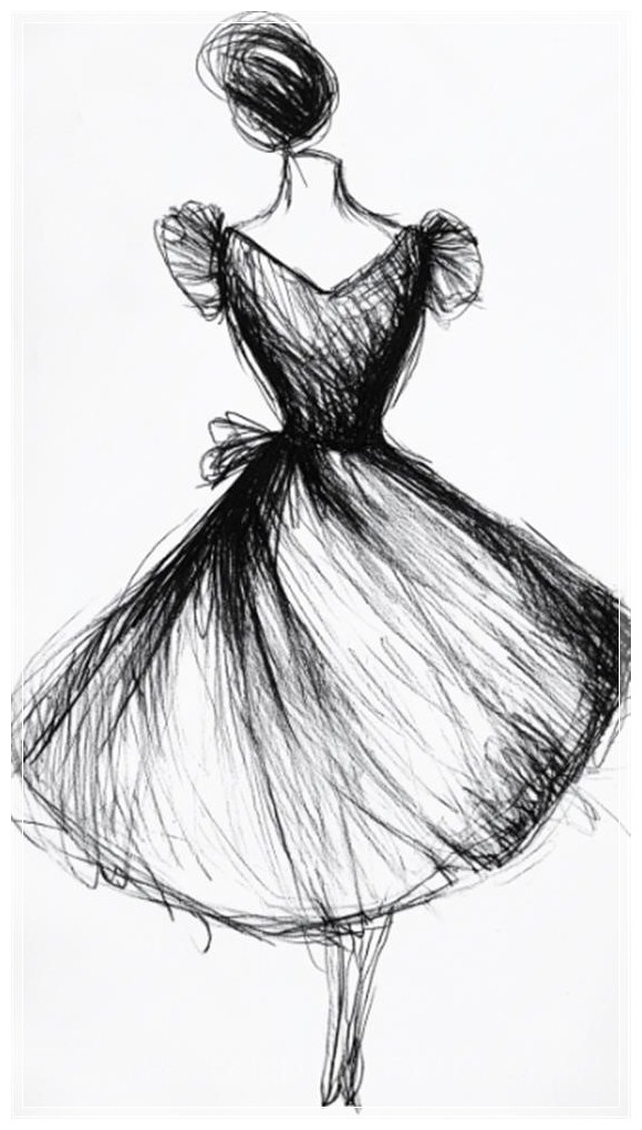 Với một đường nét phác thảo đơn giản nhưng đầy tinh tế, chiếc váy của Karl Lagerfeld hiện lên qua mỗi nét vẽ như một tác phẩm nghệ thuật sống động. Được vẽ bằng bút chì, từng đường cắt, từng nếp gấp của vải được tái hiện một cách chính xác, mang đến cảm giác vừa hiện đại, vừa cổ điển. Mỗi nét vẽ dường như thổi hồn vào bộ trang phục, tạo nên một vẻ đẹp thanh thoát và quyến rũ.