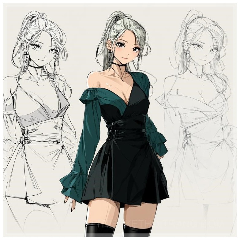 Những bộ trang phục nghệ thuật này mang trong mình sự kết hợp giữa kỹ thuật vẽ tay tinh xảo và các yếu tố mang tính biểu tượng, đậm chất anime. Đặc biệt, phong cách "1woman lose lineart" khiến người xem cảm nhận được một sự pha trộn giữa sự mềm mại và góc cạnh, như một tác phẩm hội họa chưa hoàn thiện, nơi những đường nét mờ nhạt và chuyển động nhẹ nhàng làm tăng vẻ đẹp huyền bí của bộ trang phục. Những chi tiết được thể hiện một cách tinh tế, làm nổi bật lên sự dịu dàng trong từng đường nét vải vóc, tạo ra một phong cách vừa mạnh mẽ vừa nữ tính.
