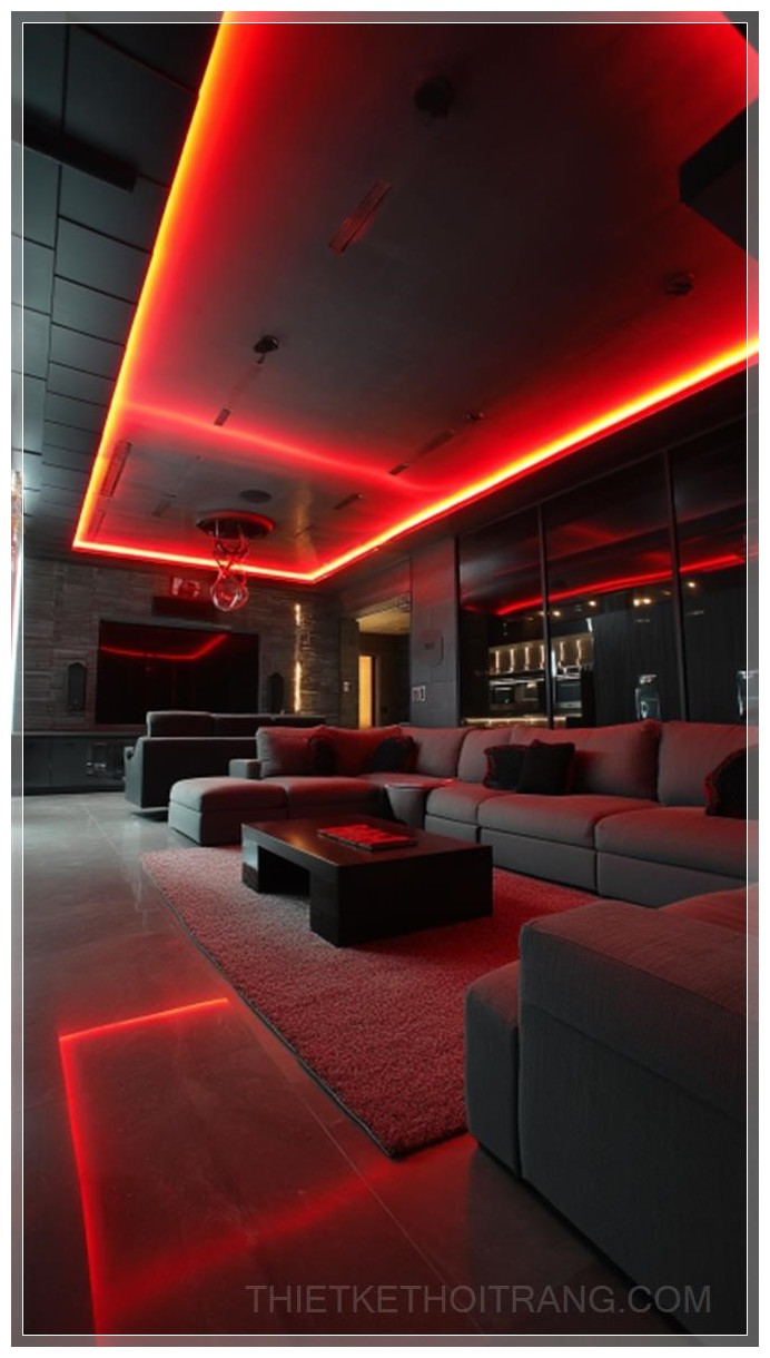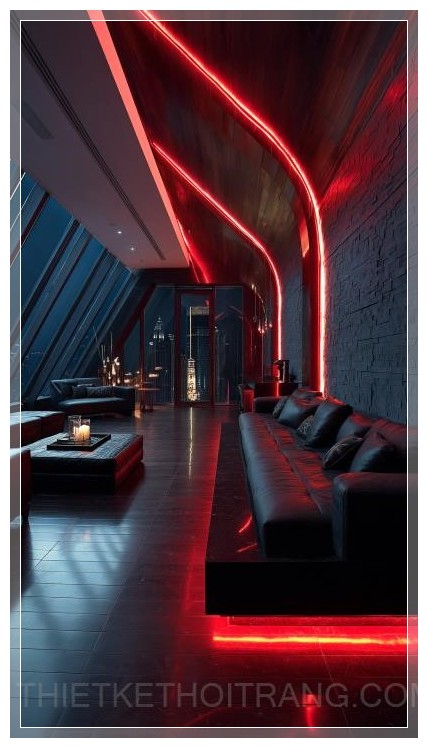 Ánh sáng đỏ LED chạy dọc theo trần và các góc phòng, vừa tạo nên một hiệu ứng ánh sáng cuốn hút, vừa giúp làm nổi bật những chi tiết trang trí tinh tế. Những chiếc đèn này không chỉ đơn thuần là nguồn sáng, mà là một phần không thể thiếu trong việc tạo ra không gian huyền bí và hiện đại, khiến bất kỳ ai bước vào cũng cảm thấy như lạc vào một thế giới khác.