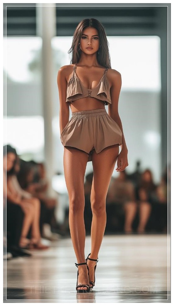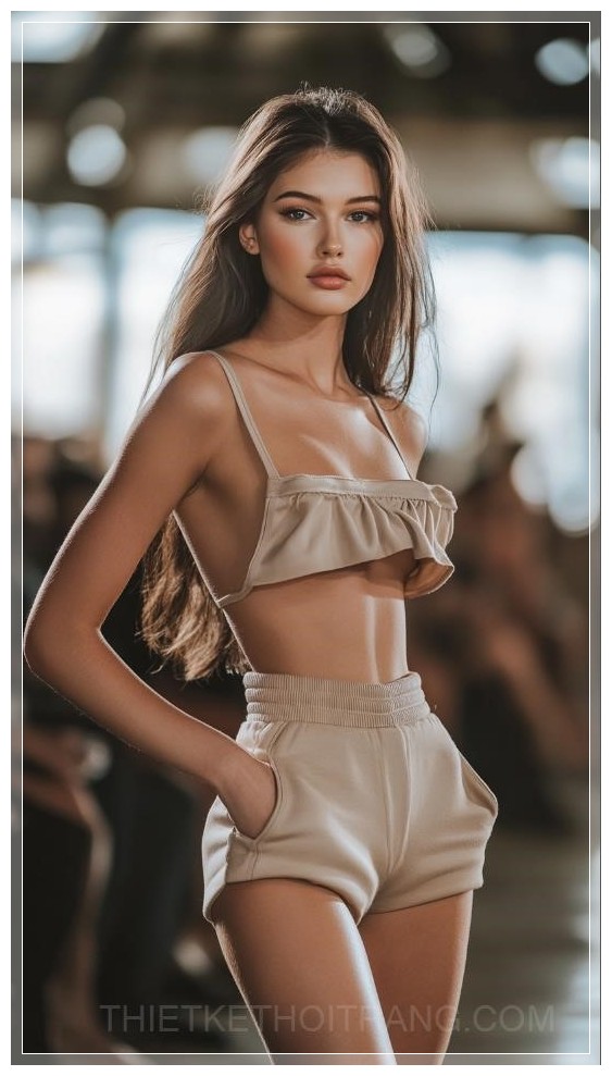 Cô nàng người mẫu tóc nâu, khoảng 30 tuổi, đứng thư giãn trên sàn diễn với một dáng vẻ tự nhiên và đầy cuốn hút. Tay cô nhẹ nhàng đặt dọc theo cơ thể, tạo nên một dáng đứng thanh thoát và không hề gượng gạo. Trang phục của cô là một chiếc áo ngắn màu trung tính kết hợp với quần short đồng màu, tôn lên sự thanh thoát và phong cách thời trang đơn giản nhưng đầy tinh tế. Đôi giày cao gót đen cổ điển càng làm nổi bật vẻ đẹp hoàn hảo của bộ trang phục.