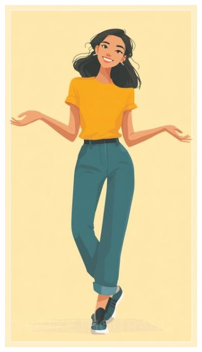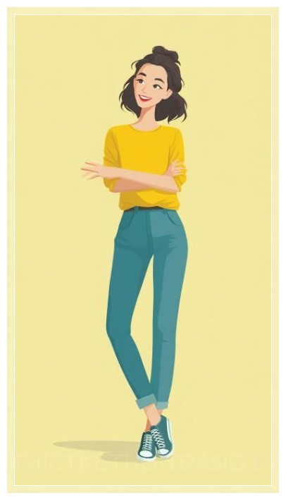 Cô đứng tự tin trên nền màu sắc trơn đơn giản, tạo nên một hình ảnh dễ tiếp cận và dễ gần. Tư thế vững chãi, khuôn mặt rạng rỡ với nụ cười tươi tắn, ánh mắt đầy lạc quan và quyết tâm, tất cả tạo nên một vẻ ngoài đầy năng lượng. Sự đơn giản trong từng chi tiết – từ chiếc áo thun cơ bản cho đến đôi sneakers – nhưng lại vô cùng phù hợp cho một ngày làm việc tại các dự án cộng đồng, nơi mà sự thoải mái và tính thực tế là những yếu tố quan trọng nhất.