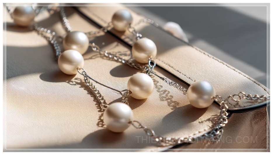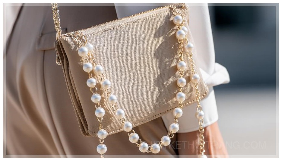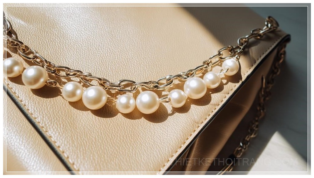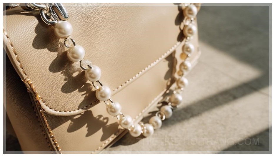 Chuỗi ngọc trai này không chỉ làm tăng thêm tính thẩm mỹ mà còn mang đến một phong cách cá tính, đầy sáng tạo cho chiếc túi xách. Màu sắc của ngọc trai trắng mờ kết hợp với tông màu be hay kem của túi tạo ra sự kết hợp nhẹ nhàng, thanh lịch, rất thích hợp cho những buổi dạo phố hay đi làm. Dù đơn giản nhưng những chi tiết tinh tế này chắc chắn sẽ làm bạn nổi bật giữa đám đông.