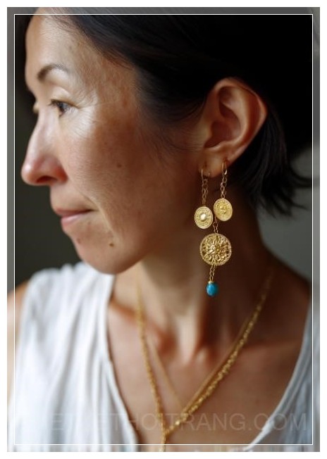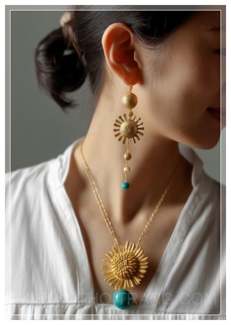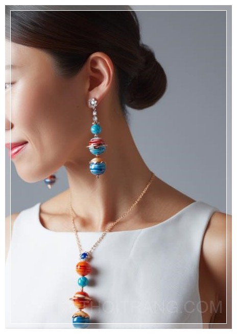 Trong một khoảnh khắc đầy lôi cuốn, những chiếc khuyên tai hình hành tinh và mặt trời lấp lánh, treo trên tai của một người phụ nữ, như những viên ngọc quý từ vũ trụ. Chúng không chỉ là món đồ trang sức mà còn là biểu tượng của sự kết nối vô tận giữa con người và không gian vô hạn. Một chiếc vòng cổ vàng mảnh mai, với một hành tinh khác treo xuống, tạo nên sự hài hòa hoàn hảo với chiếc mặt đá xanh phía trên, như ánh sáng tỏa ra từ những vì sao xa xôi.