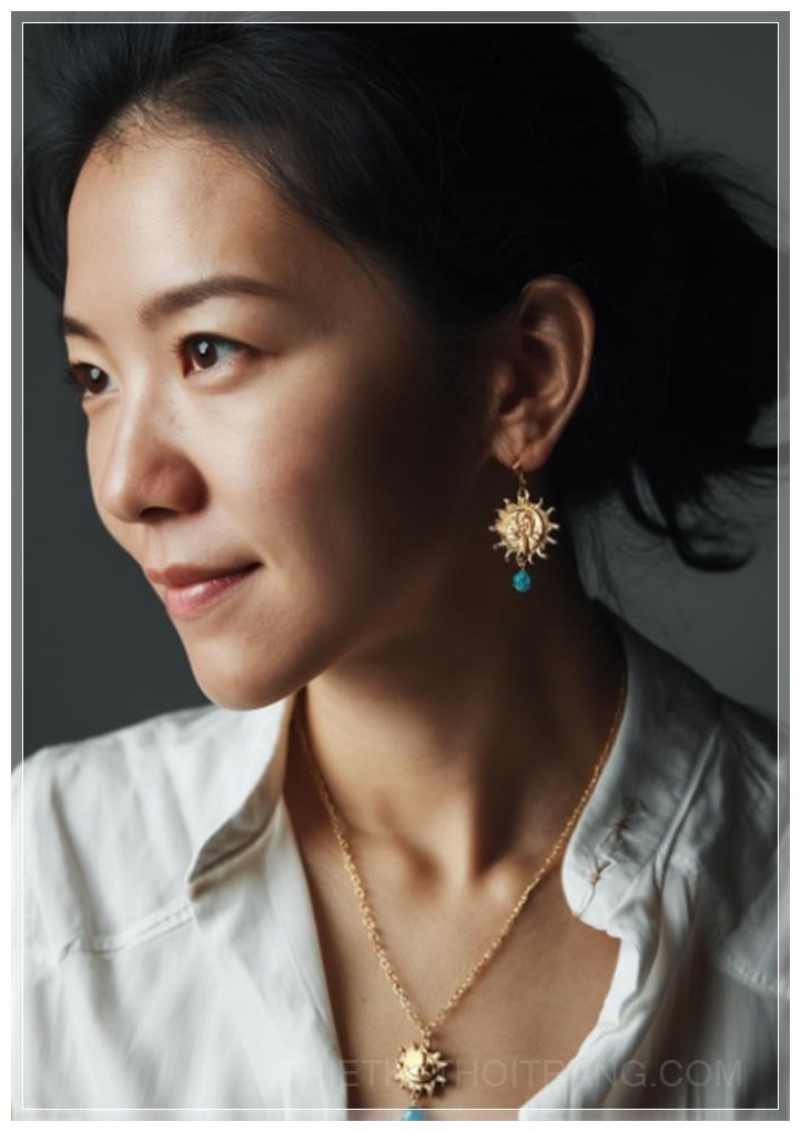 Người phụ nữ Trung Quốc trong bộ trang phục trắng đơn giản đứng phía sau, với dáng vẻ thanh thoát và nhẹ nhàng. Không có bất kỳ món trang sức nào khác để làm phân tán sự chú ý; tất cả đều tập trung vào những chi tiết tinh tế của chiếc khuyên và vòng cổ. Chỉ có cô và những món đồ trang sức, tạo nên một tổng thể hoàn hảo giữa cái đẹp hiện đại và sự huyền bí của thiên hà.