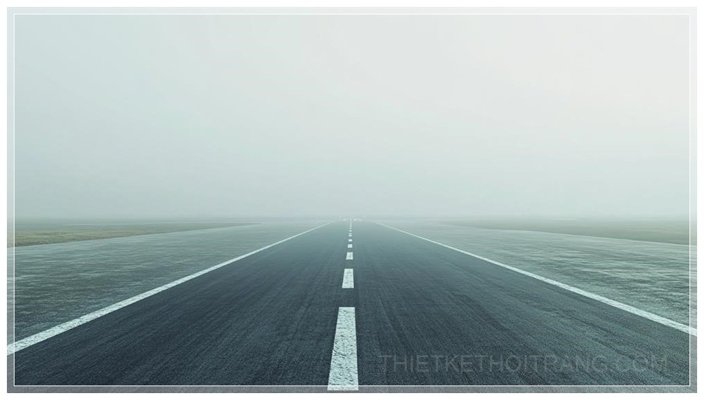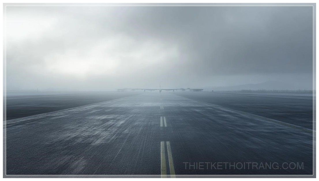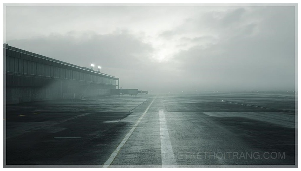 Đứng bên lề sân bay, nơi những con đường băng trải dài và hoang vắng, bạn sẽ cảm nhận được sự tĩnh lặng kỳ lạ của không gian xung quanh. Một lớp sương mù mỏng manh bao phủ, tạo ra một bức tranh mờ ảo, nhạt nhòa, nơi mà mọi thứ dường như chìm trong sự mờ ảo của xám xịt.