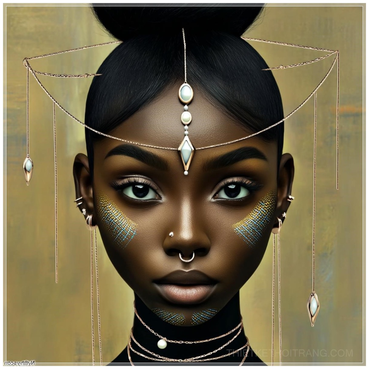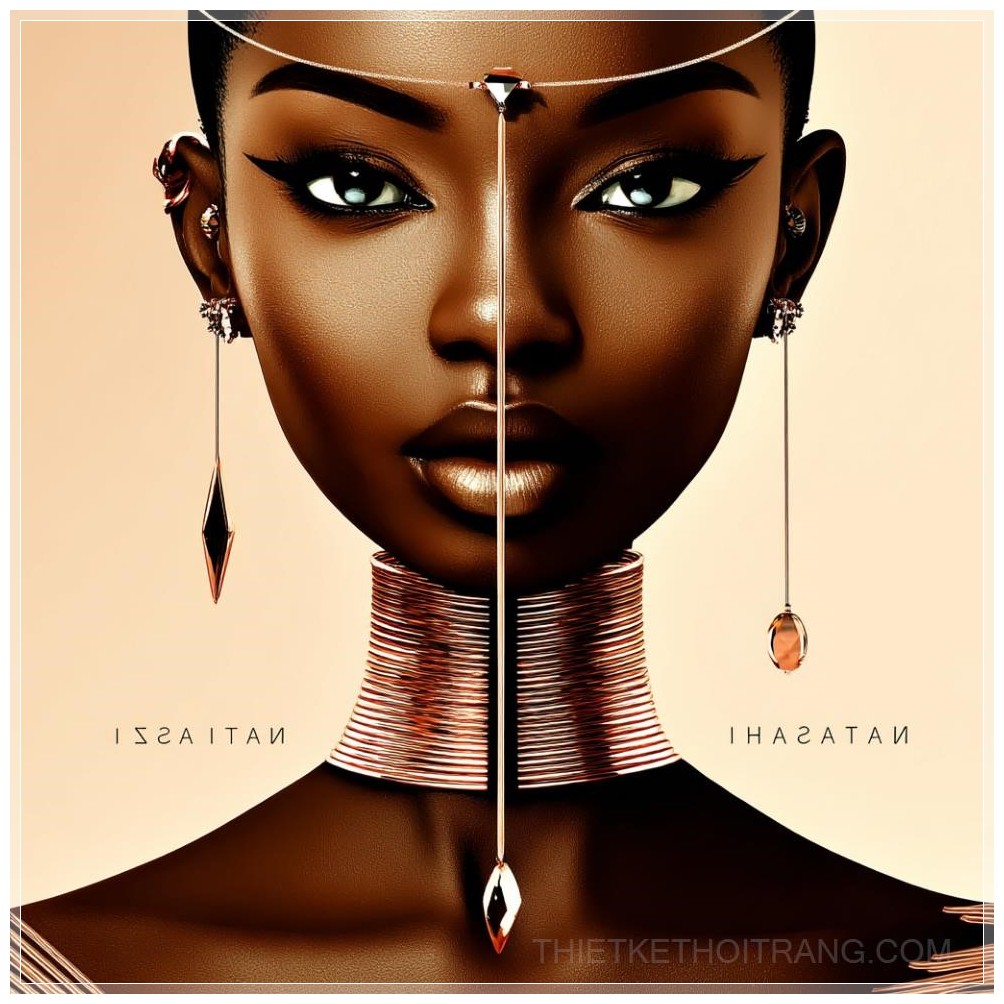 Cô đeo bộ trang sức tinh tế bằng vàng hồng, bao gồm chiếc vòng cổ mảnh mai, những chiếc khuyên tai nhẹ nhàng với các viên kim cương nhỏ (khuyên tai tragus, conch, rook và anthelix), và một chiếc vòng septum vàng hồng mảnh. Tóc cô được tô điểm thêm bằng một chuỗi tóc vàng hồng mảnh mai với các viên kim cương nhỏ và một viên pha lê trong suốt, đặt trên trán, tỏa sáng như một viên kim cương có giá trị cao, tạo nên một nét thiết kế mang đậm ảnh hưởng của văn hóa châu Phi.