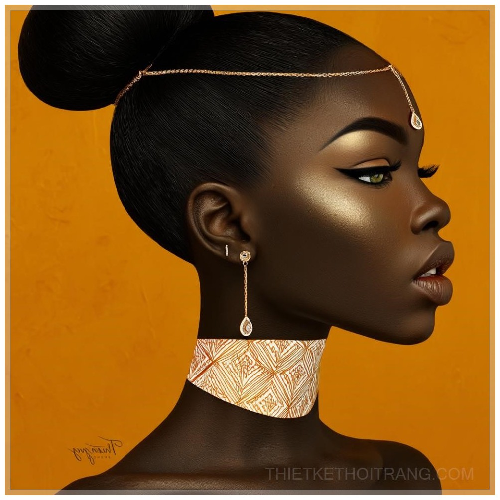 Trong ánh sáng mờ ảo của studio, một người phụ nữ trẻ hiện lên với dáng vẻ đầy uyển chuyển và thanh tao. Làn da đen sâu bóng khỏe khoắn, tỏa sáng như gỗ đen bóng, tạo nên một sức hút mê hoặc, từng chi tiết trên cơ thể cô như được vẽ nên từ tỷ lệ vàng. Gương mặt cô nhẹ nhàng, dễ thương, mang vẻ đẹp nhẹ nhàng nhưng cuốn hút. Lớp trang điểm tối giản với những điểm nhấn nhẹ nhàng ở gò má, cung môi, bọng mắt và xương quai xanh, mang đến vẻ ngoài như làn da thủy tinh trong suốt, với đôi môi bóng mượt nhẹ nhàng.