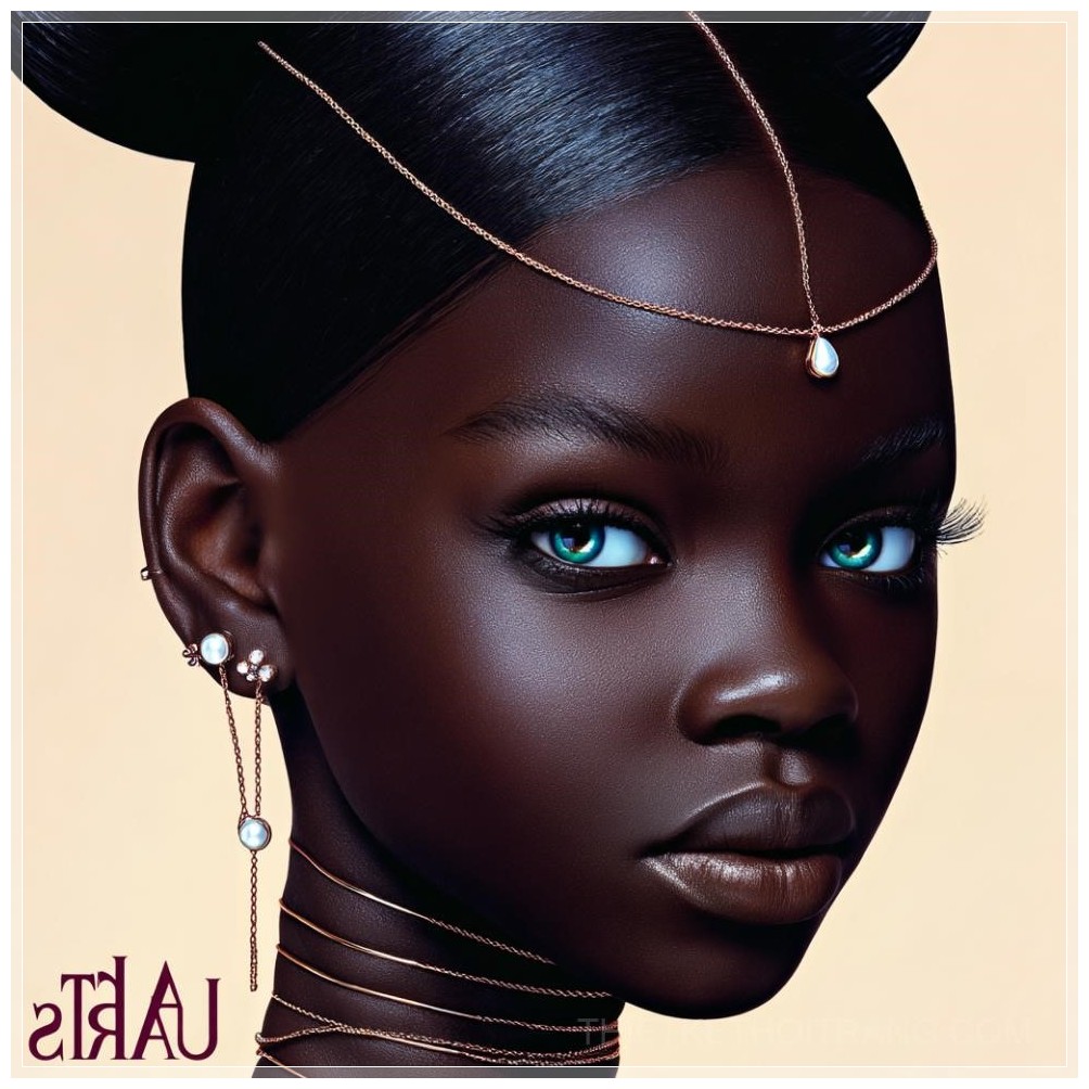 Điểm nổi bật nhất trên gương mặt cô là đôi mắt màu xanh lá biển sáng lấp lánh, mang đến một sự tương phản sắc nét với làn da đen bóng. Đôi mắt này phản chiếu ánh sáng studio như những viên đá quý, nổi bật và đầy cuốn hút. Mái tóc thẳng, bóng mượt, được tạo kiểu búi cao, tạo nên sự tương phản mạnh mẽ với màu mắt sáng lấp lánh của cô.