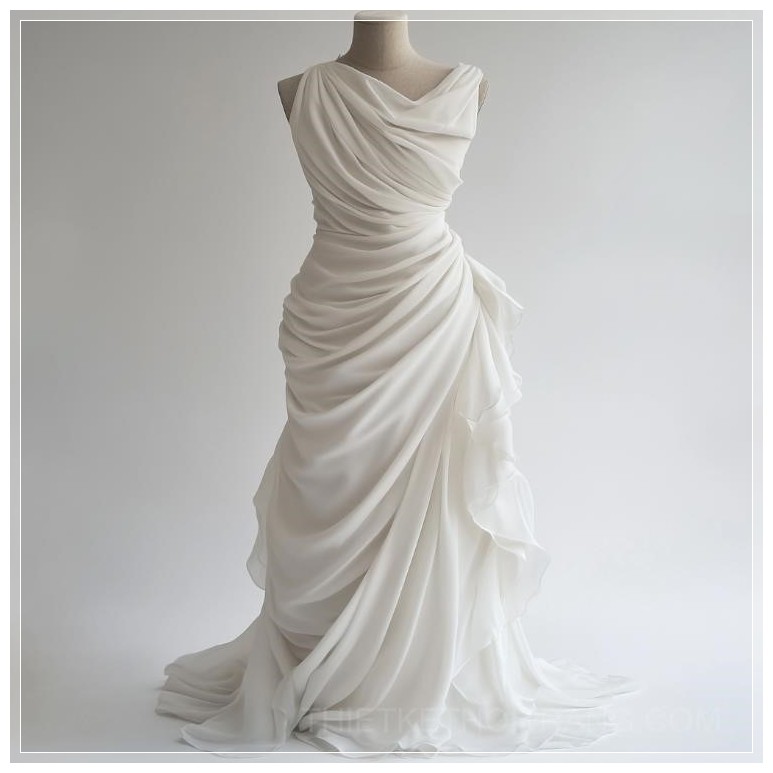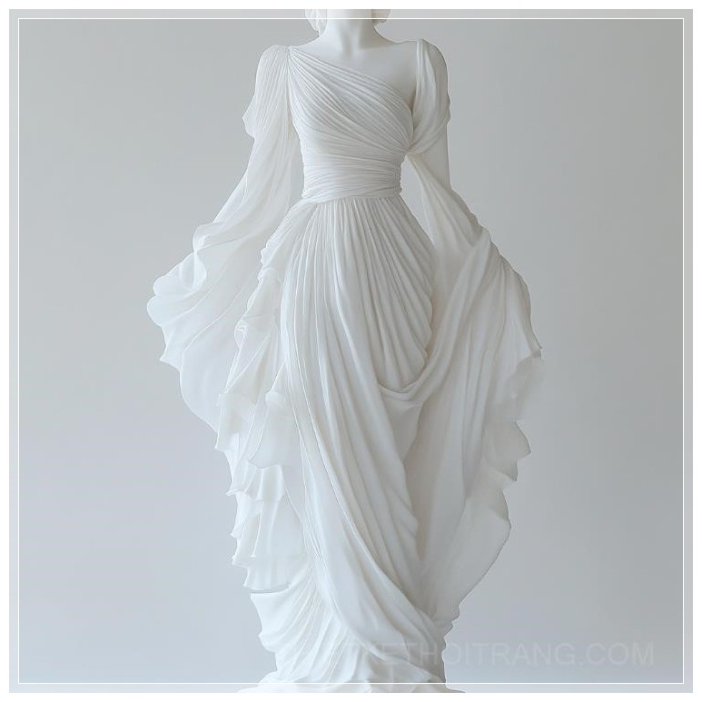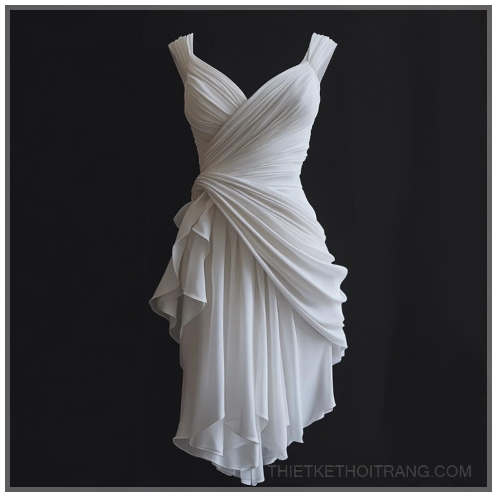 Chiếc váy trắng drapered, với chất liệu vải mềm mại và nhẹ nhàng, mang đến một vẻ đẹp tinh tế và sang trọng. Sự kết hợp hoàn hảo giữa chất liệu bay bổng và kiểu dáng draped tạo nên sự thanh thoát, uyển chuyển trong từng chuyển động. Màu trắng tinh khiết không chỉ thể hiện sự thuần khiết mà còn làm nổi bật hình dáng và sự thanh thoát của người mặc.