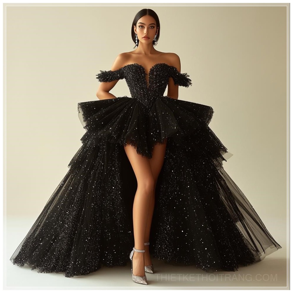 Với đôi giày cao gót thanh mảnh, chiếc đầm này không chỉ hoàn thiện vẻ ngoài mà còn mang lại cảm giác tự tin và cuốn hút. Sự kết hợp giữa chất liệu tulle nhẹ nhàng và lớp vải lụa mềm mại khiến người mặc như đang bước đi trong một không gian đầy ánh sáng và sự huyền bí.
