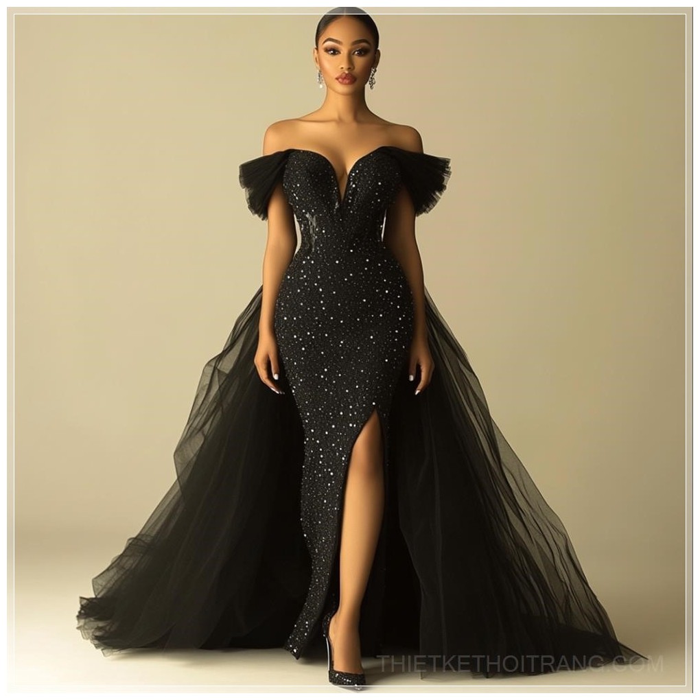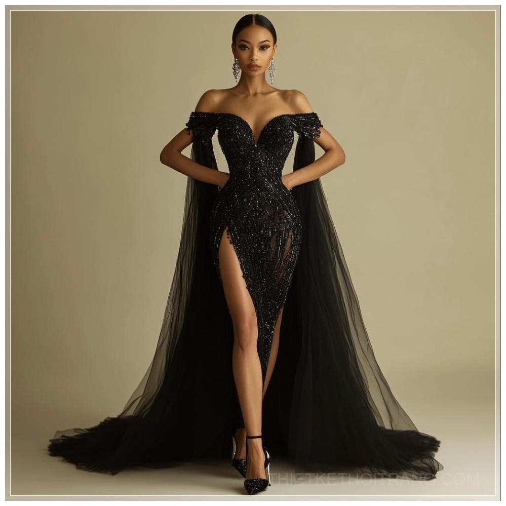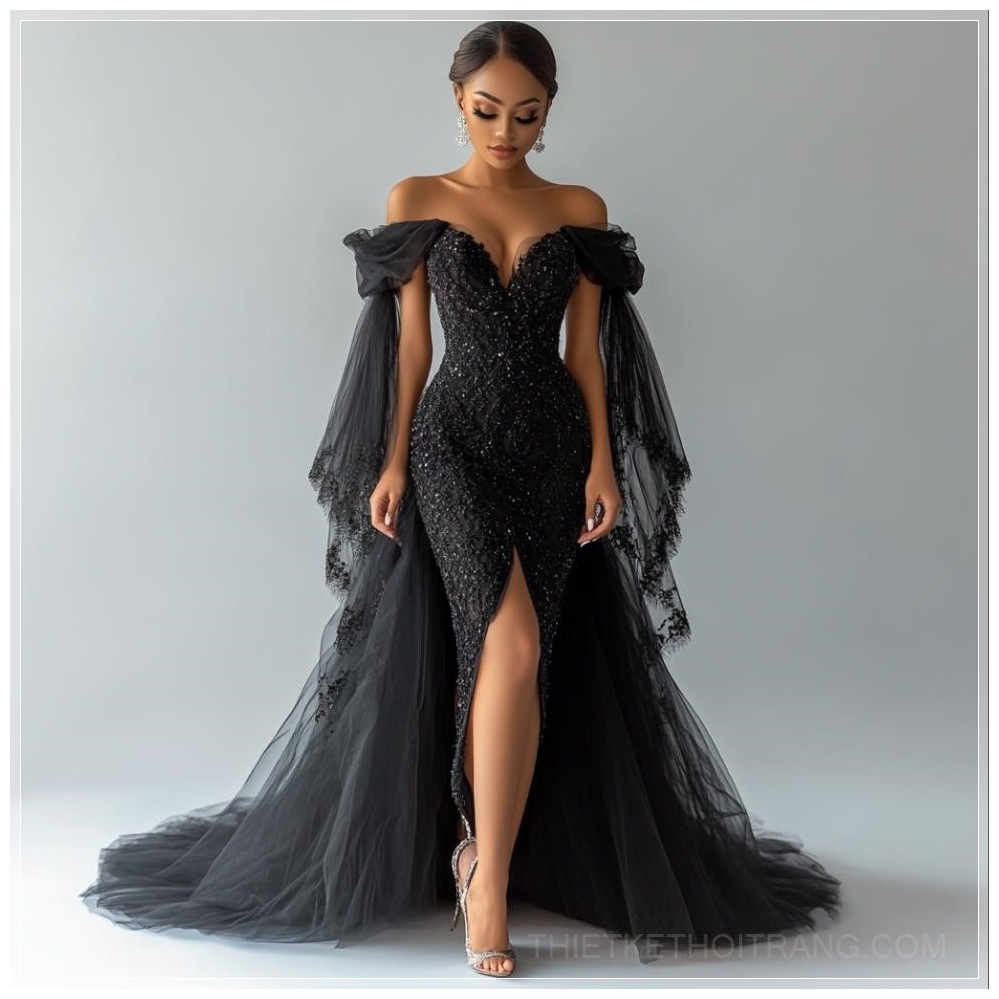 Chiếc đầm mermaid màu đen này thật sự là một tác phẩm nghệ thuật tinh xảo, tôn vinh sự thanh lịch và quyến rũ của người phụ nữ. Được thiết kế với kiểu dáng ôm sát cơ thể, chiếc đầm dài đến sàn, che phủ hoàn hảo đôi chân, nhưng lại mang đến sự quyến rũ một cách đầy tinh tế với những chi tiết đặc biệt.