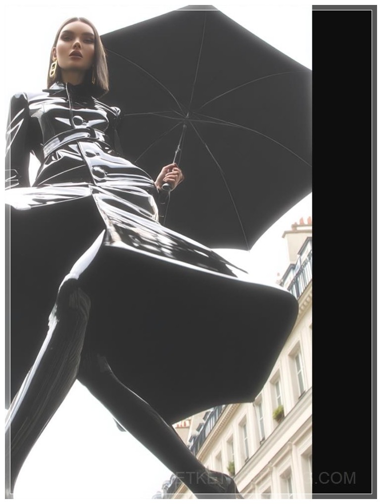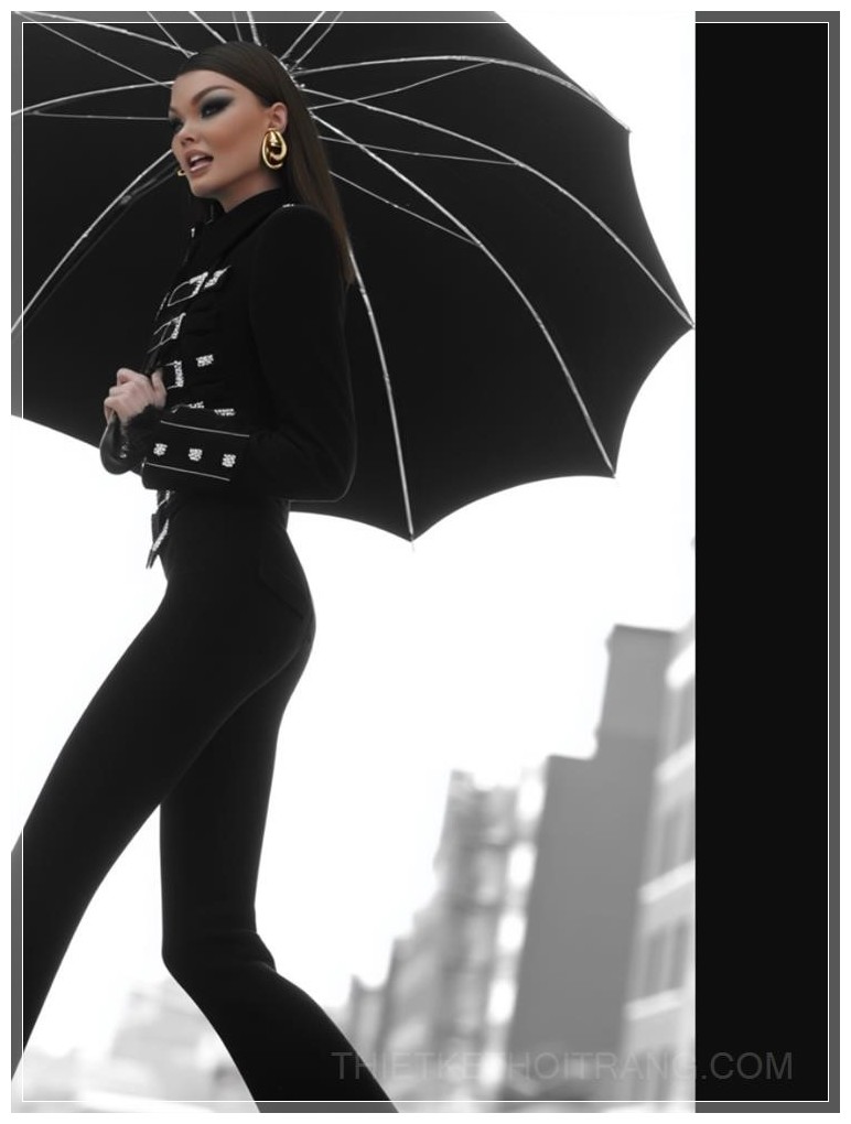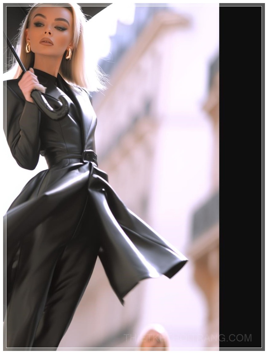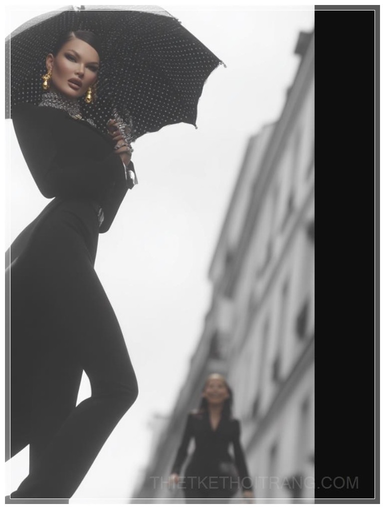 Đôi giày cao gót mảnh mai cùng chiếc quần ống suông tinh tế khiến bước đi của cô thêm phần tự tin và quyến rũ. Đặc biệt, khi cô nhẹ nhàng nhảy qua một vũng nước, bộ trang phục của cô toát lên sự mạnh mẽ và duyên dáng không thể rời mắt. Áo khoác structured, những chiếc khuyên tai vàng đơn giản, và chiếc ô đen to bản tạo thành một tổng thể hài hòa, lôi cuốn ánh nhìn của bất kỳ ai trên phố.