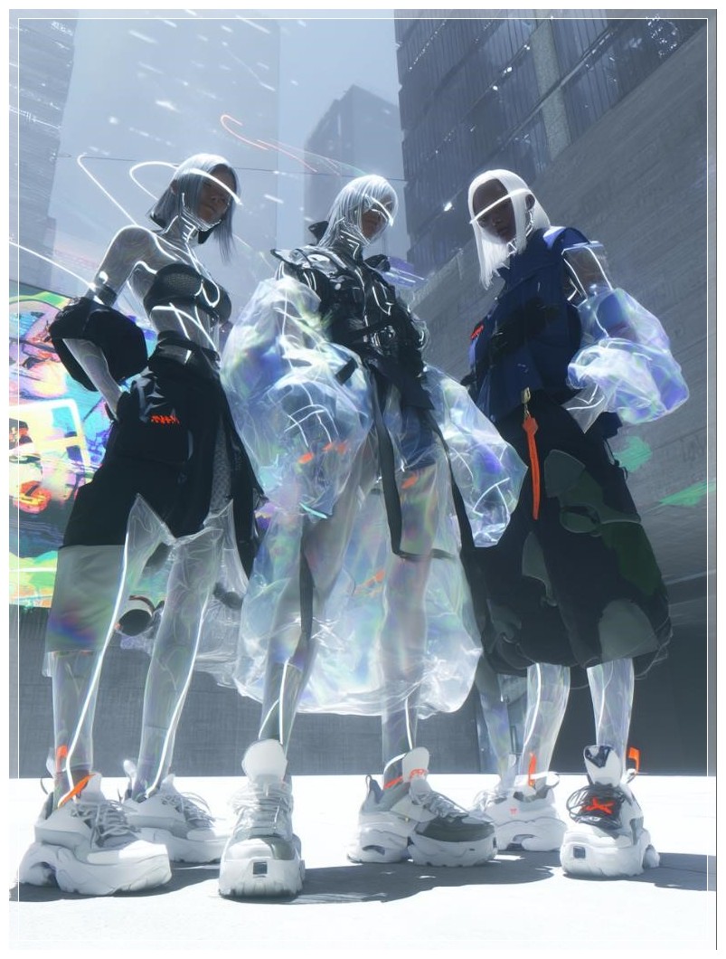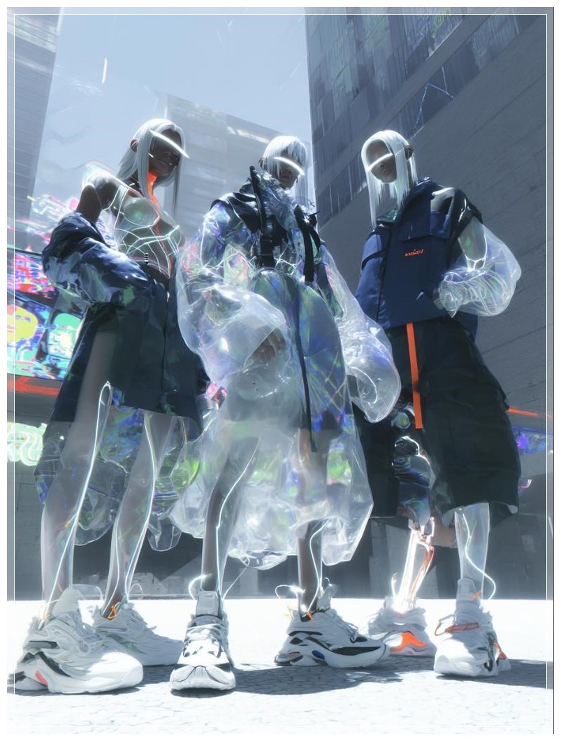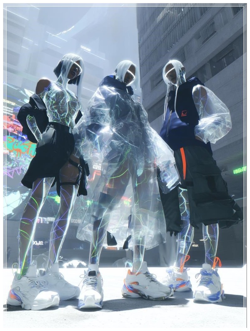 Trong một quảng trường ánh sáng rực rỡ của thành phố cyberpunk, một nhóm giới trẻ thanh thoát đứng yên, như bị đóng băng giữa những khoảnh khắc hoàn hảo. Những cơ thể trong suốt của họ tỏa ra ánh sáng dịu nhẹ, từ làn da bán trong suốt, lộ ra những sợi dữ liệu mờ ảo như những sợi dây tơ mảnh mai lướt qua từng cử động. Quần áo của họ, từ những chiếc áo khoác phản chiếu ánh sáng đến những chiếc áo vest chiến thuật trong suốt, từ những chiếc hoodie vải thông minh bất đối xứng đến đôi giày thể thao modul có dây điện neon, tất cả đều kết hợp hoàn hảo với không gian xung quanh.