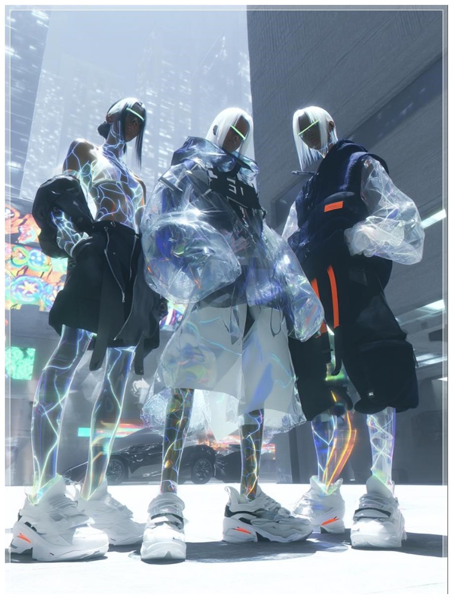 Đứng giữa một quảng trường tối tăm đầy những vệt ánh sáng neon, khuôn mặt của họ thể hiện một sự xa cách, giống như những mô hình trong không gian ảo. Những quảng cáo hologram lướt qua trong không khí mờ ảo, graffiti kỹ thuật số nở rộ trên các bức tường, và màn sương neon nhẹ nhàng lướt qua khắp không gian. Mọi chi tiết trong cảnh vật, từ ánh sáng đến bóng tối, từ đường phố đến các tầng lớp dữ liệu, tất cả đều hòa quyện để tạo ra một khoảnh khắc hoàn hảo của thời trang hậu nhân loại.