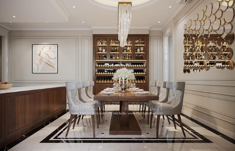 Phòng bếp lồng phòng ăn tạo nên sự thông thoáng, tiện nghi nhưng đẹp, sang trọng tại biệt thự hiện đại Xuân Phương.